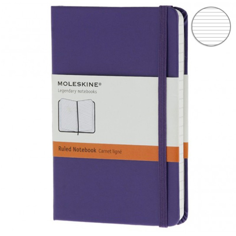 Небольшой блокнот Moleskine фиолетового цвета в твердом переплете. Имеется карман внутри, а также фиксирующая резинка.