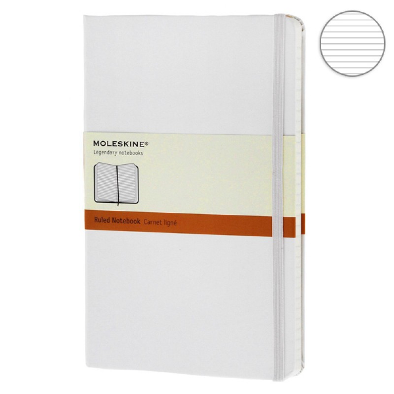 Белый классический молескин в твердом переплете. Бумага размечена в линейку.