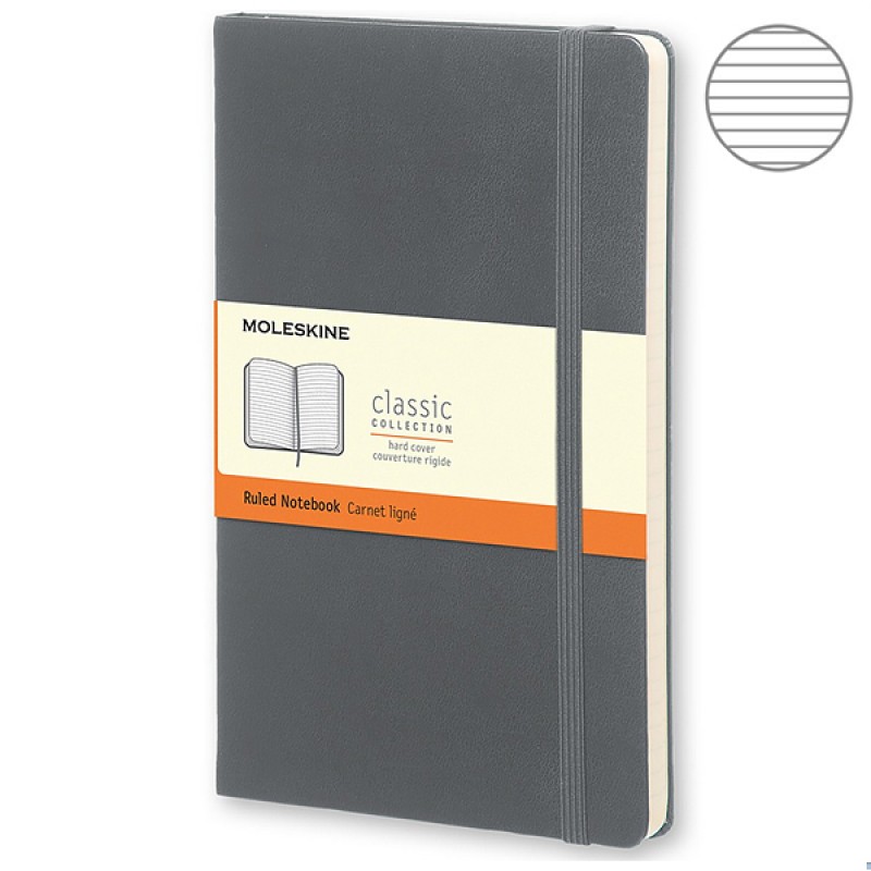 Классический молескин среднего размера в твердой обложке. Страницы размечены в линейку.
