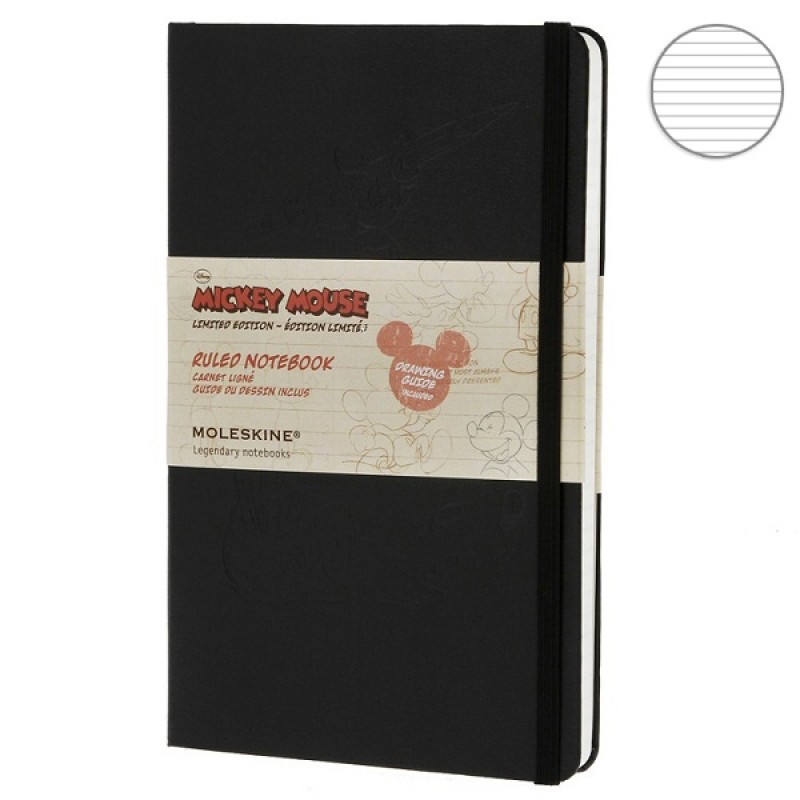 Оригинальный Moleskine Disney небольшого размера в твердой черной обложке с глянцевым тимнением. Внутри имеется небольшой карман, есть также фиксирующая резинка.