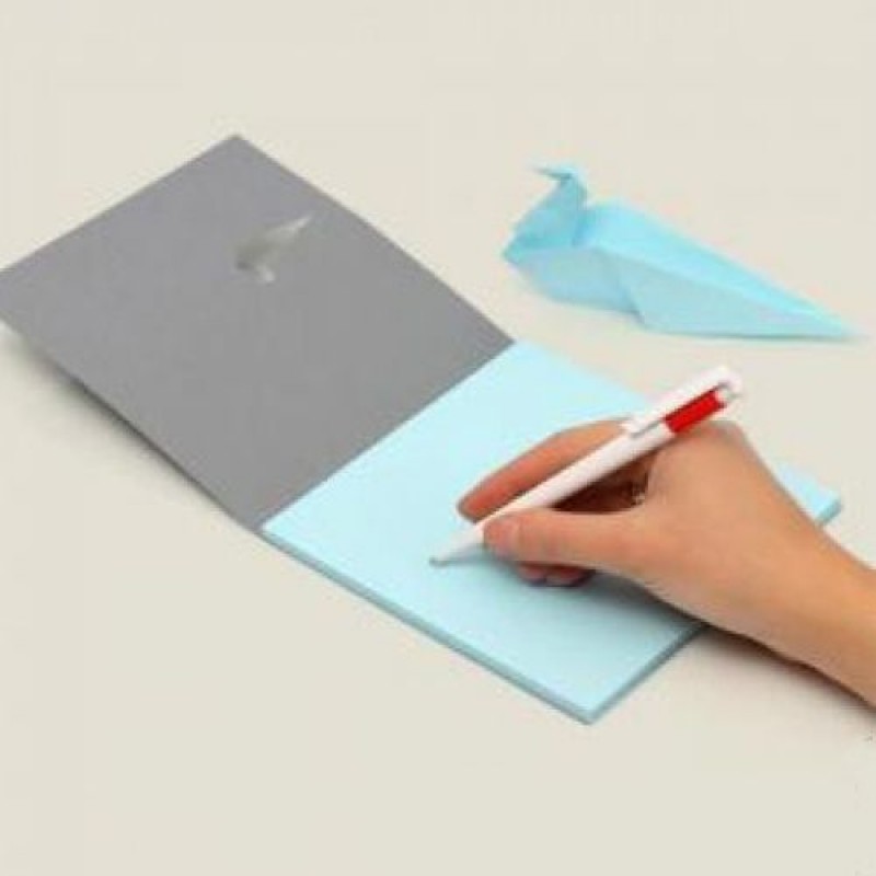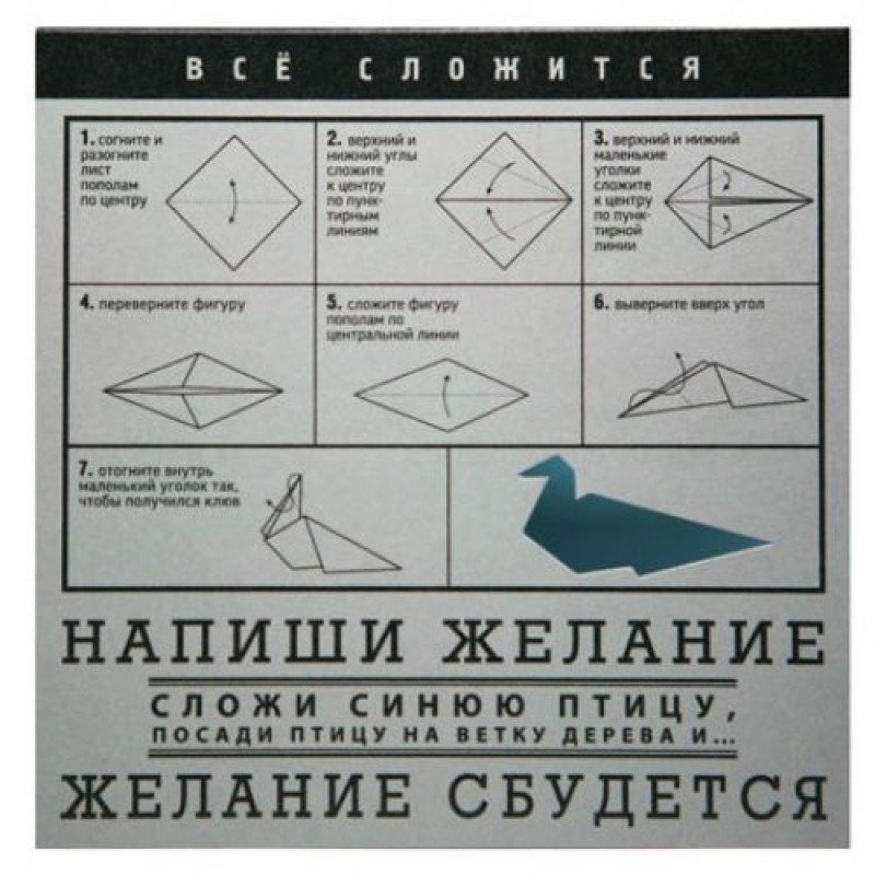 Счастье – это такая штука, которая становится больше, только если ею делишься. На этом замечательном механизме и основан наш блокнот-оригами. Всё просто: берете лист, складываете птицу по инструкции и оставляете где-нибудь на ветке дерева. А дальше, поскольку все ищут Синюю птицу удачи, ваша птичка не остается невостребованной. И вот кому-то везет найти вашу птицу, он счастлив. Тут же вам плюс в карму, а ваши мечты начинают сбываться стремительным домкратом.