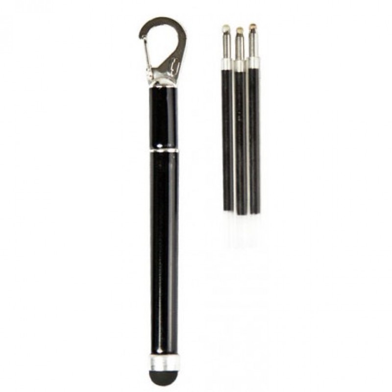 Брелок - телескопическая ручка с чувствительным стилосом для сенсорных экранов с другой стороны, укомплектован 3 стержнями черного цвета. Размеры: сложенная 87ммХ7мм, разложенная 127ммХ7мм