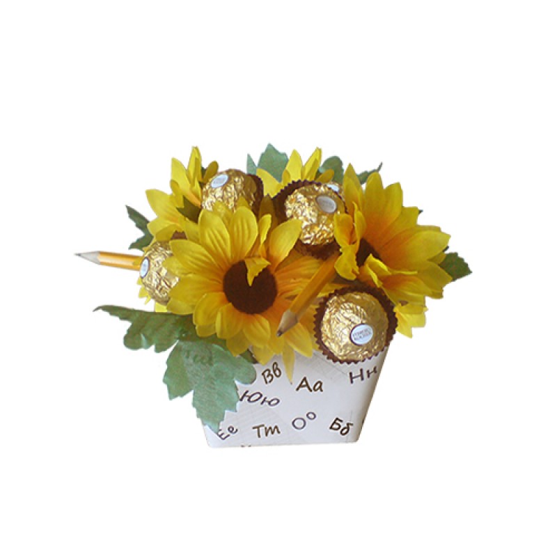 В состав букета входят: коробка Raffaello, FerreroRocher (8шт), карандаши (2шт), флористический материал.