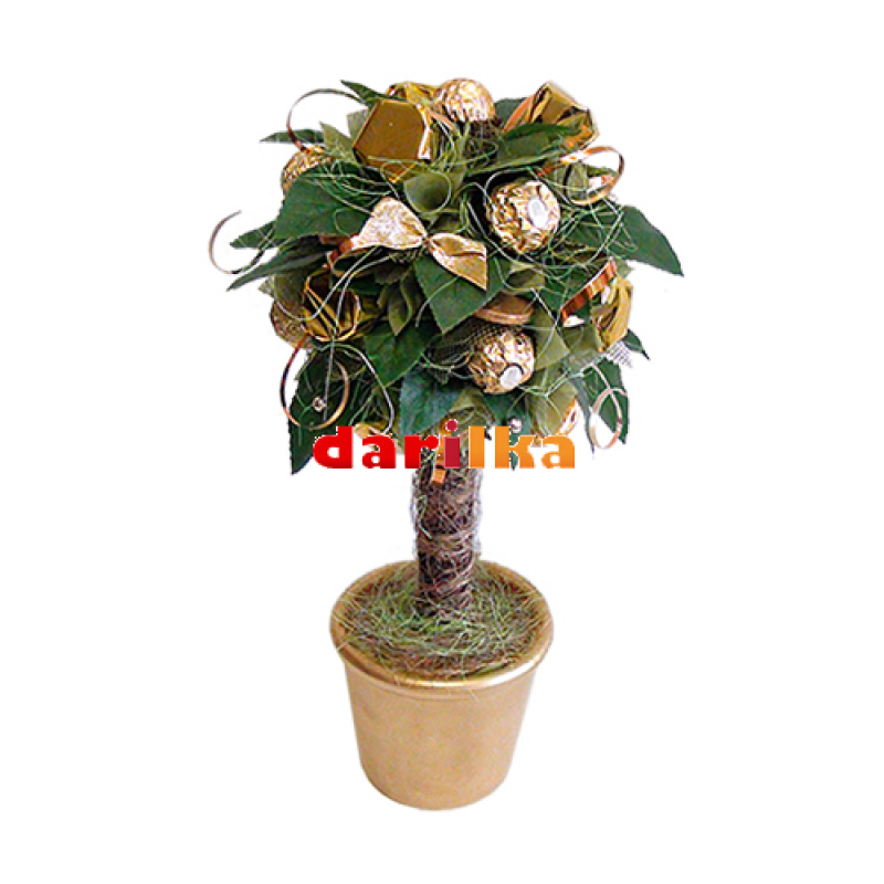 | Материал | Ferrero Rocher + Рошен + шоколадные монеты - 25шт, вазон, флористический материал. |