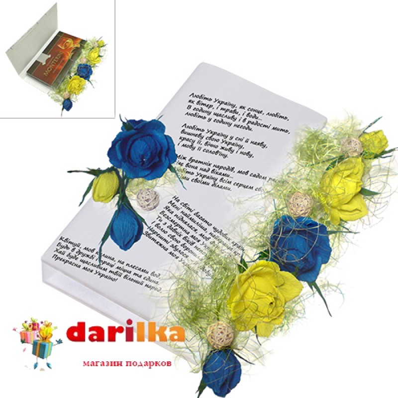 Состав: коробка конфет Рошен " Monterini", Raffaello 8 шт. (внутри цветков), флористический материал. Обложка книги расписана стихами украинских поэтов.