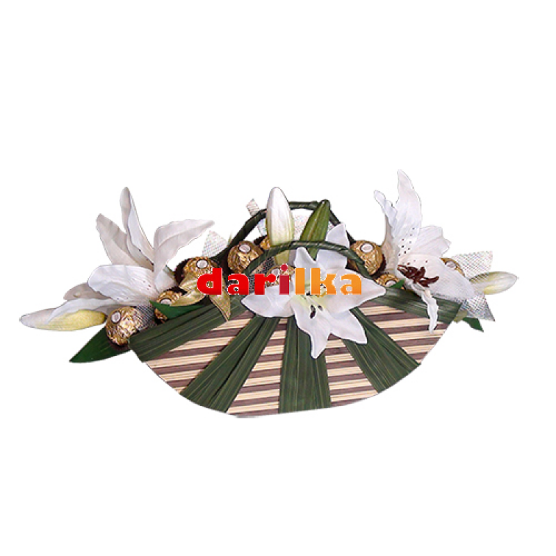 | Состав | конфеты FerreroRocher: 15шт, корзинка, лилии (искуственные), флористический материал |