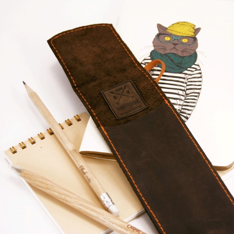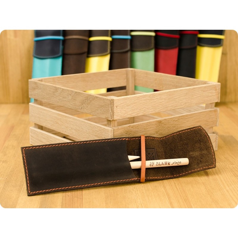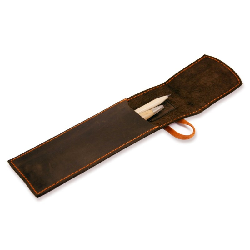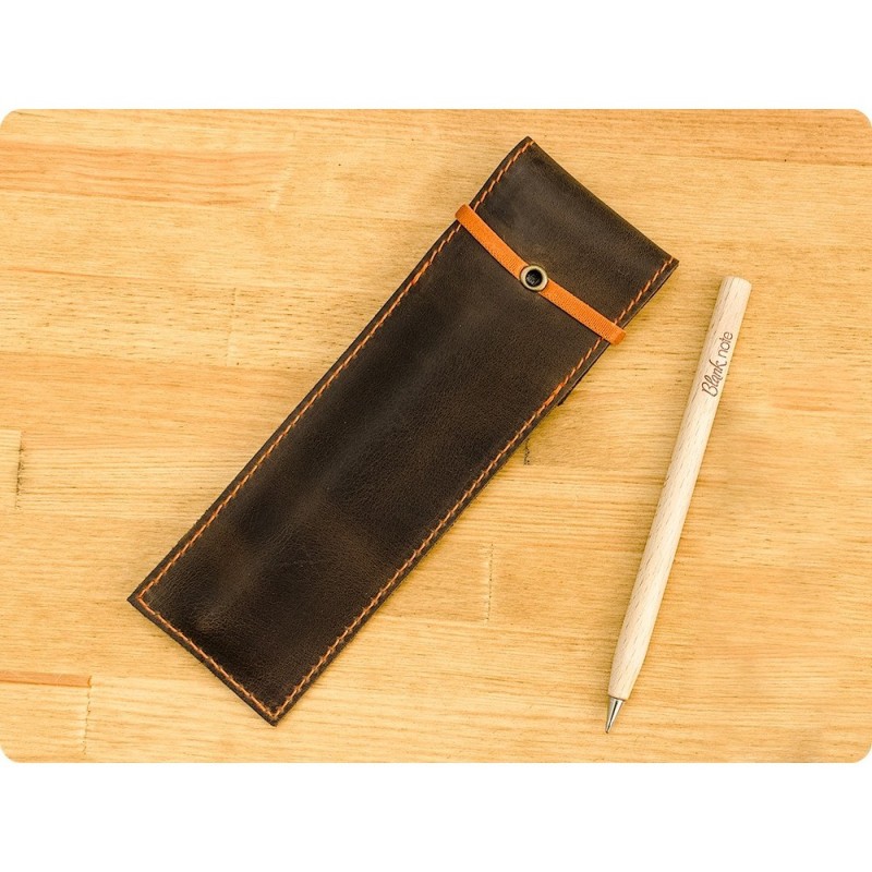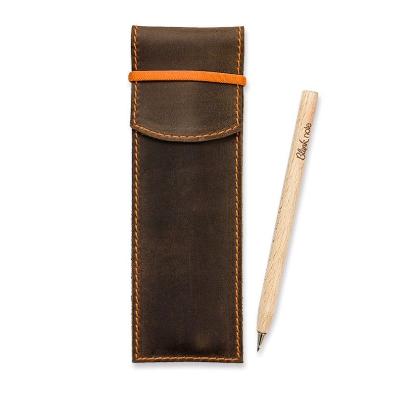 Качественный чехол для ручек - отличный подарок как деловому человеку, так и творческой личности, студенту. Чехол из натуральной кожи, ручной работы. Закрывается чехол с помощью резинки, поэтому ручки и карандажи надежно лежат в нем и не выпадают. В комплект к чехлу идет деревянная эко-ручка и карандаш с логотипом Фабрики BlankNote. Чехол для ручек 1.0 Орех-апельсин - стильный подарок для работы и творчества.