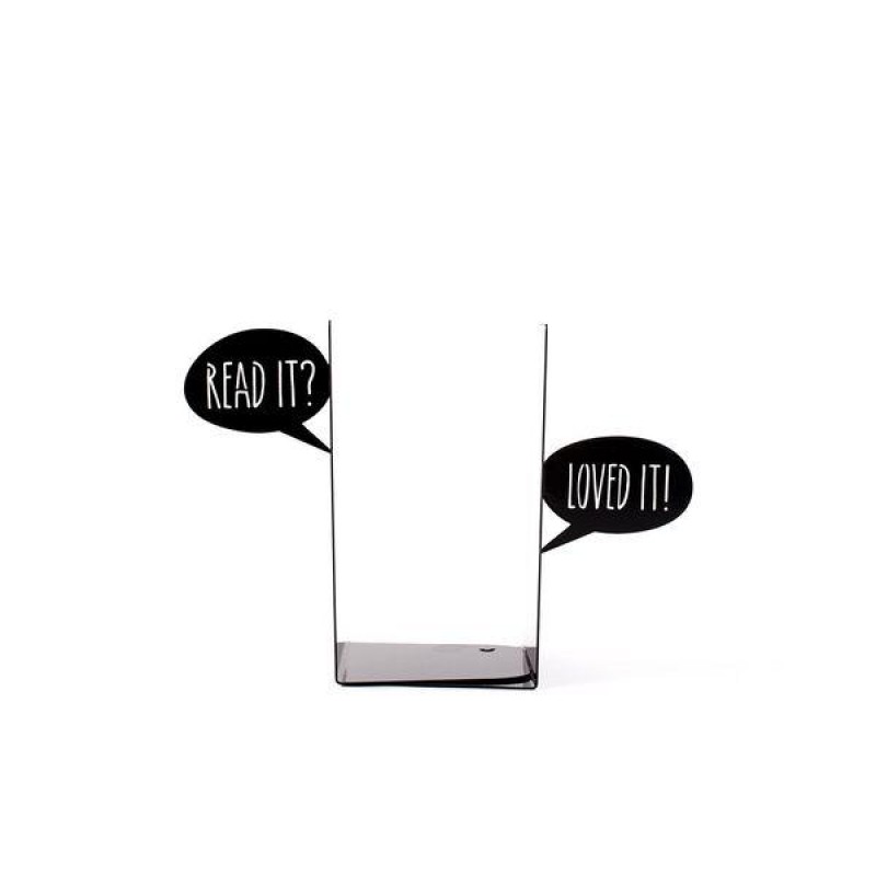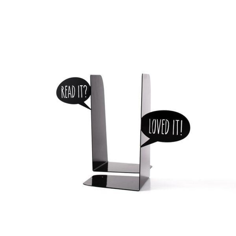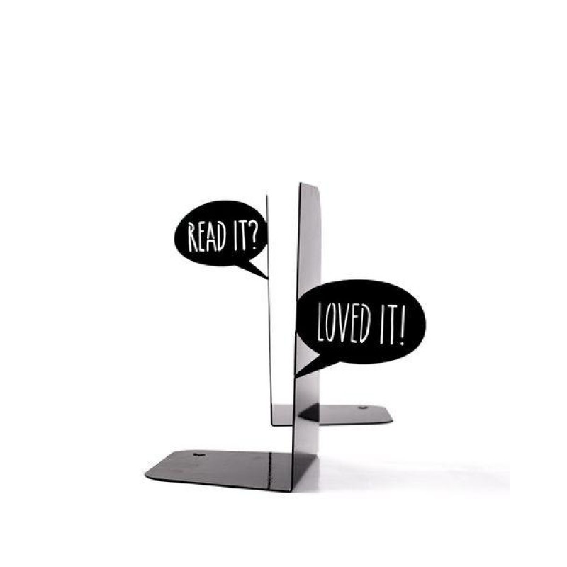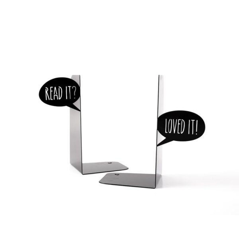 Металлические упоры в виде двух облаков с фразами. Самый часто встречающийся диалог между людьми, которые много читают. с помощью таких упоров вы сможете выделить самые-самые любимые книги на полке. Удобно и стильно.