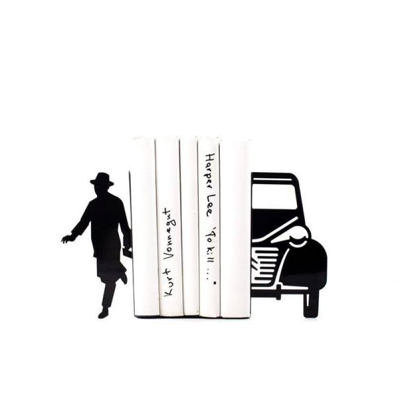Металлические упоры в форме силуетов известного португальского поэта Фернандо Пессоа с одной стороны и автомобиля с другой стороны. Иллюстрация из жизни художника. Части держателей между собой не связаны и потому могут удерживать любое количество книжек. Прекрасный подарок художественным натурам.