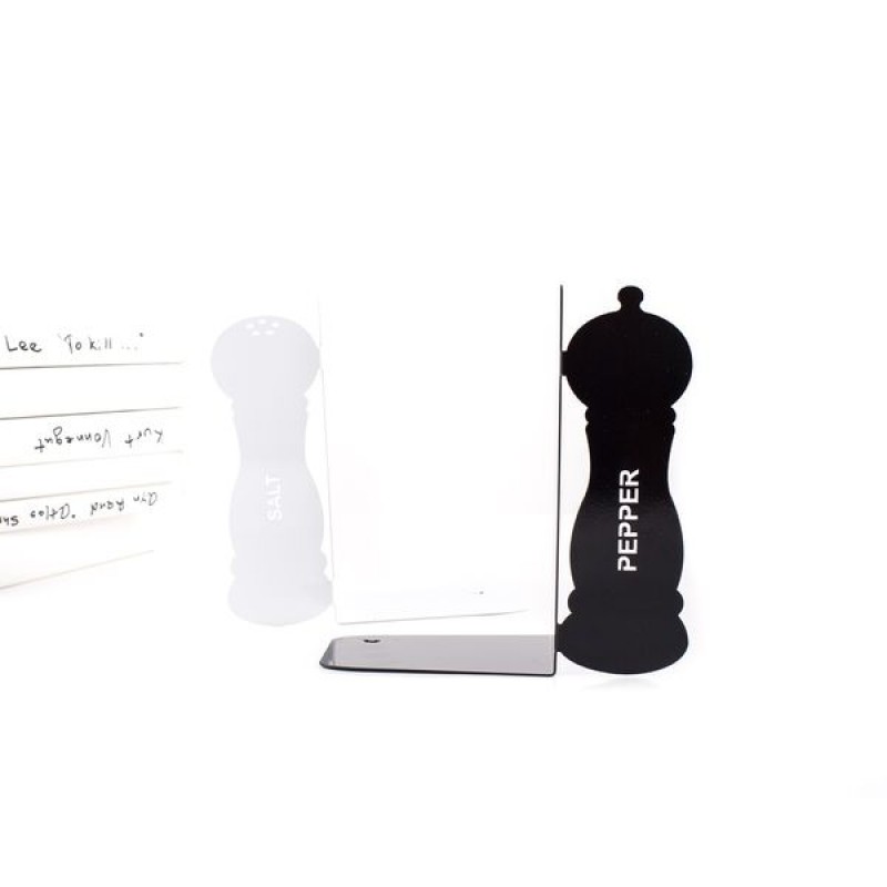 Металлические держатели для книг в форме солонки и перечницы созданы для того, чтобы удержать коллекцию ваших кулинарных книг и при этом добавить интерьеру шарма и элегантности. Чёрно-белые упоры идеально впишутся в комнату любого стиля. Хороший подарок для тех, кто не может жить без книг и кулинарии.