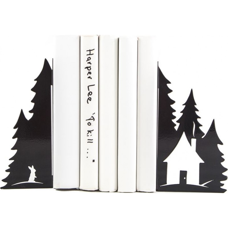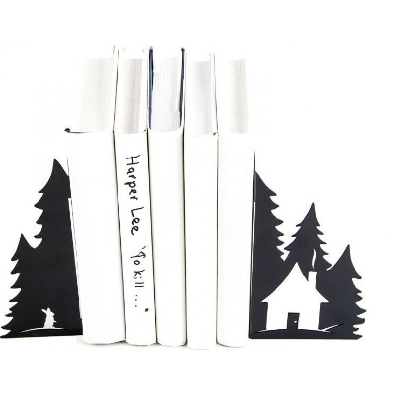 Чёрные книжные подставки для книг с тёплым домом в сосновом лесу. Идеальны для уютной книжной полки.