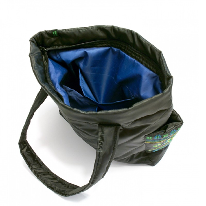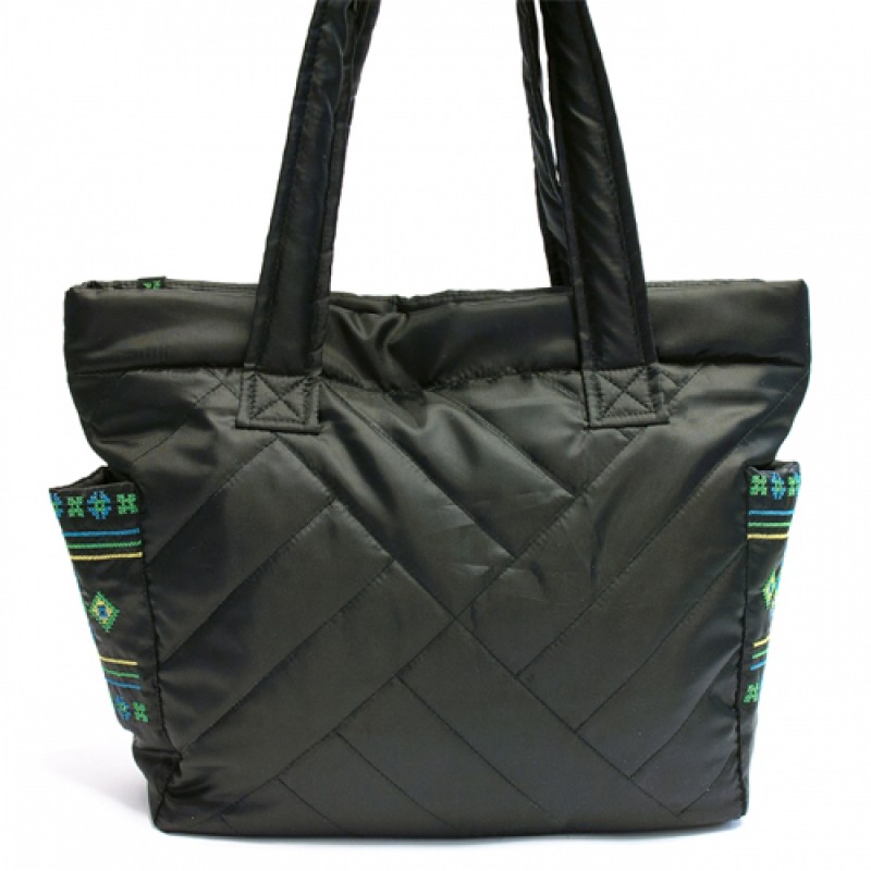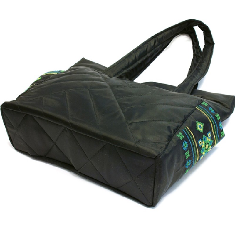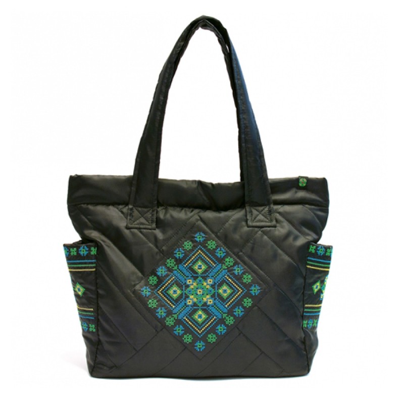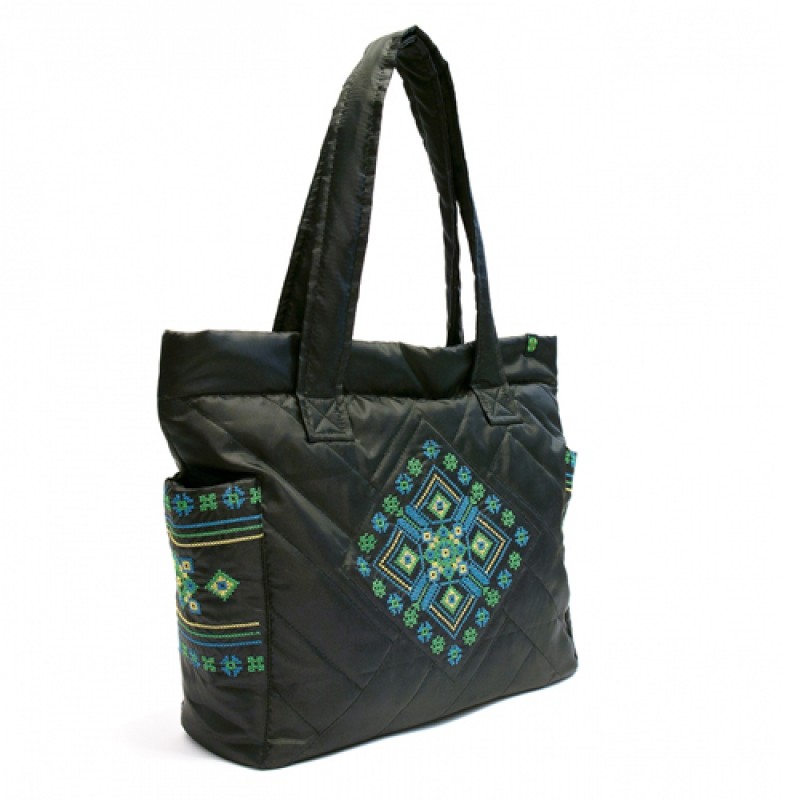 Сумка изготовлена из плащевой ткани. Сумка с вышивкой крестиком узор - геометрический орнамент - модный аксессуар. Сумка трапециевидной формы, которую дополнительно подчеркивают боковые вышитые карманы. Дутая сумка имеет уплотненное дно для дополнительной поддержки формы.