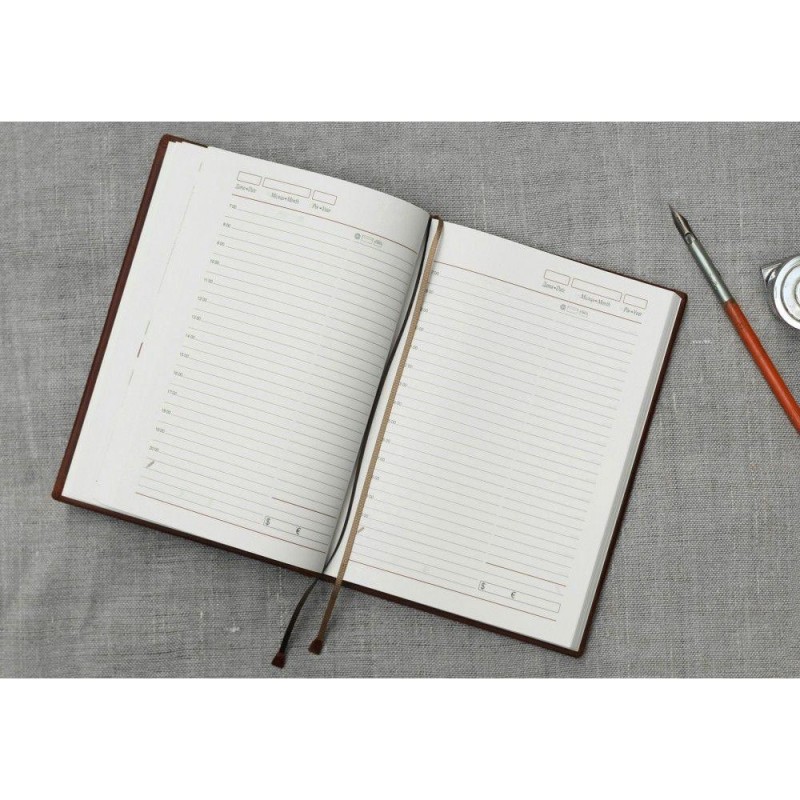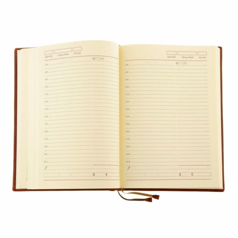 Внутри: фабричный блок, отпечатанный на кремовой бумаге. Ежедневник удобен тем, что начинать записи в нем можно с любого дня, так как блок не датированный.