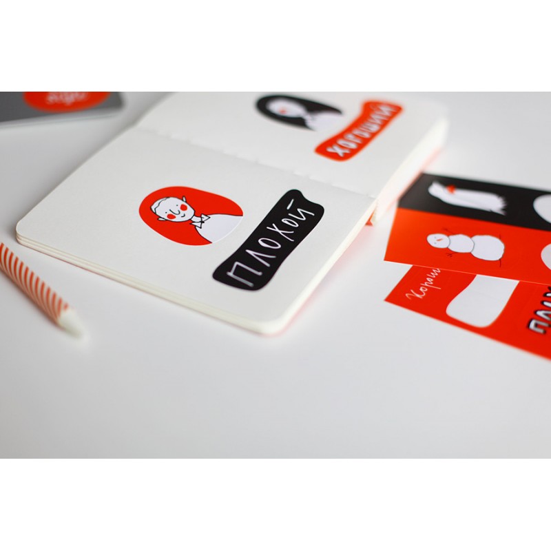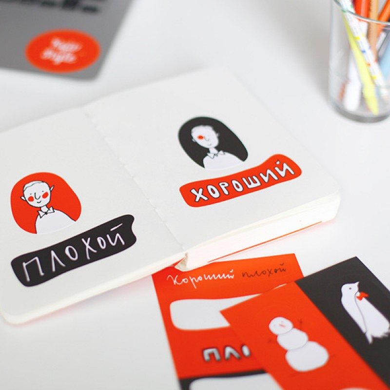 Все взрослые одновременно немножко дети, всем нам не чужды какие-то детские, чуть-чуть наивные или даже хулиганские темы. Именно для этих детей, которые живут внутри всех взрослых, был создан «Хороший Плохой блокнот». В нем мы решили сыграть на извечном антитезисе между понятиями «хорошего/плохого». Мы сопоставляем, буквально сталкиваем лбами самые неожиданные, иногда даже странные вещи. Но главная фишка в том, что все очень легко - мы намекаем, шутим, сравниваем и предлагаем выбрать, «что такое хорошо и что такое плохо». Например, кто лучше: хулиган с фингалом или правильный отличник с румянцем? Ни одну из тем мы четко не обозначаем, что вот она «хорошая», а эта, наоборот, «плохая». В общем, листайте, веселитесь, думайте. А что хорошо, и что плохо - решайте сами.