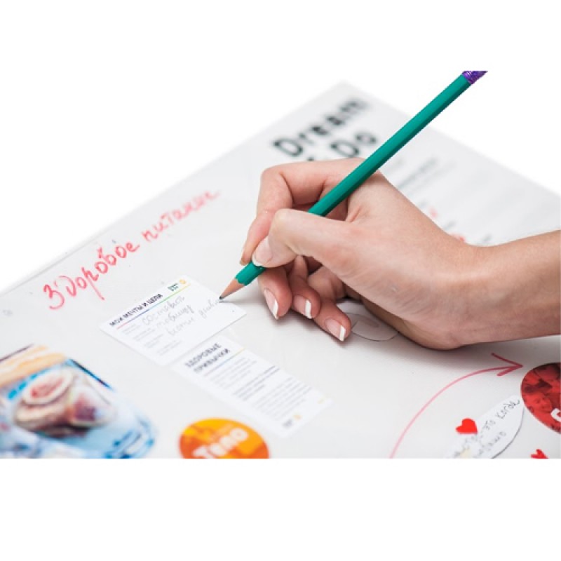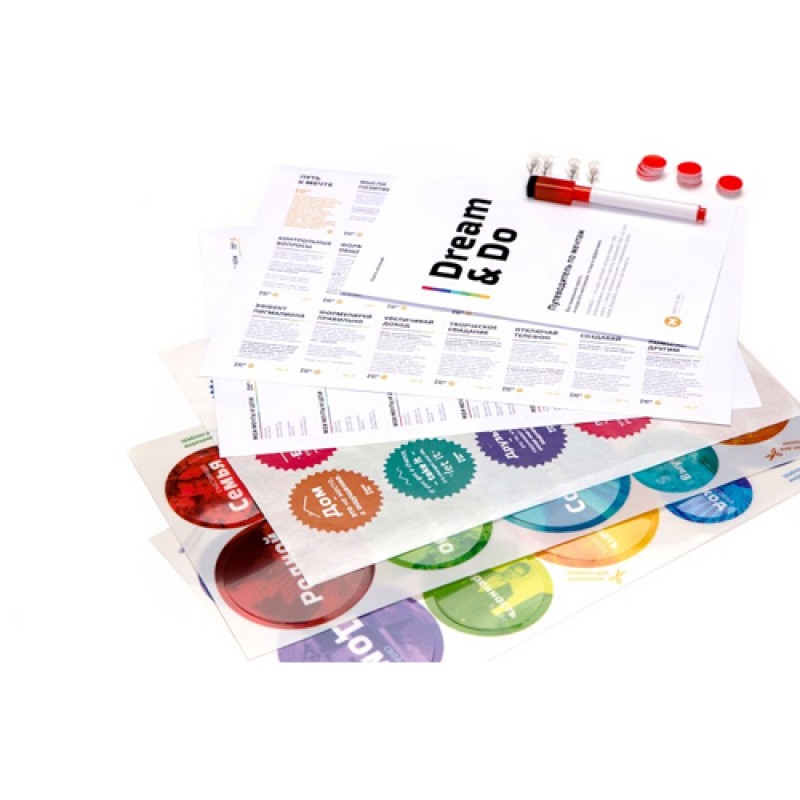 мечты-подсказки - 24 стикера с общими целями. Цвета стикеров соотвествуют зонам карты, что чоень удобно при разработки собственной карты желаний;