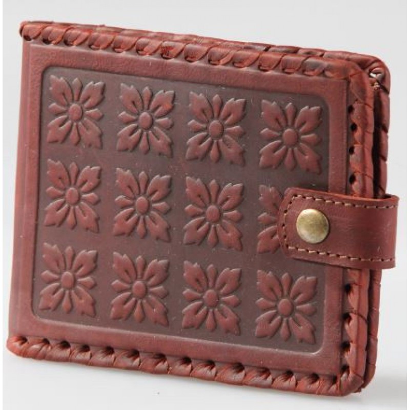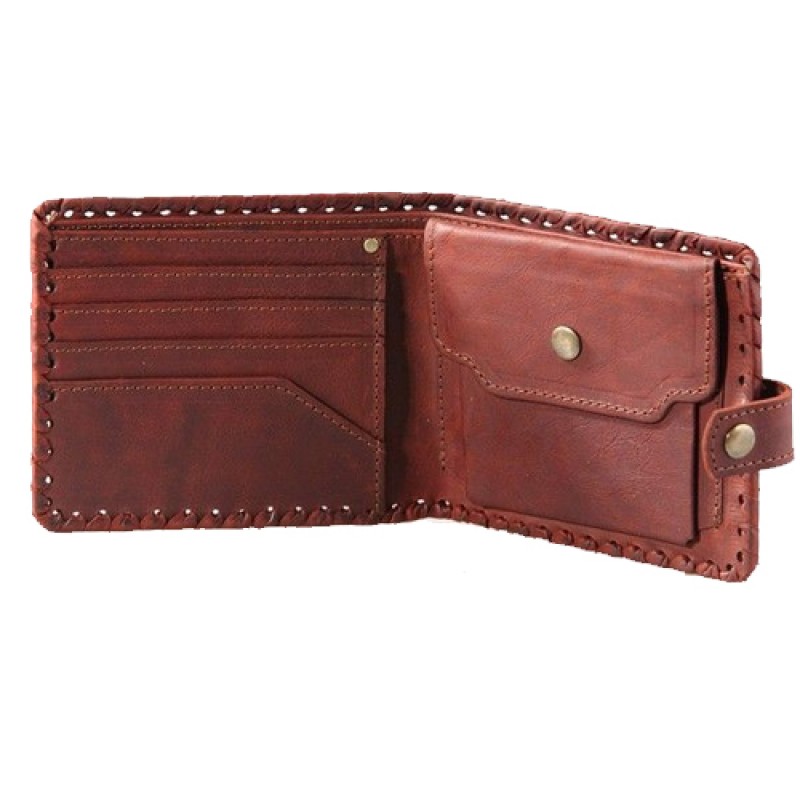 Предлагаемая модель кошелька в два сложения закрывается на клапан со скрытой кнопкой. Имеет два отделения под бумажные купюры, карман для мелочи на кнопке, секции для кредитных и дисконтных карт, потайной кармашек. По всему периметру сувенирное изделие для надежности оплетено кожаным шнурком методом ручной оплетки.