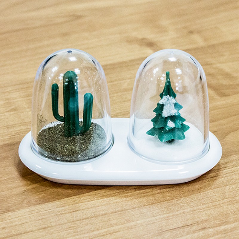 Если вы заполните соль в емкость с елкой и возникнет картина заснеженной елки, а в емкость с кактусом перец - увидите песчаные барханы. Набор для соли и перца состоит из двух емкостей на общей подставке. В одной емкости находится кактус, который ассоциируется с песком пустыни - емкость предназначена для молотого перца или других мелких специй), в другой — ель, которая в свою очередь ассоциируется со снегом (предназначена для соли). Такой набор непременно станет украшением обеденного стола. В наборе 2 ёмкости.
