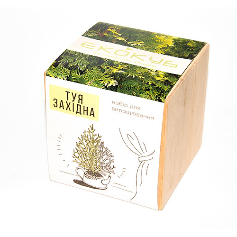 Набор для выращивания Экокуб Туя западная – вечнозеленое хвойное растение семейства кипарисовых, которое совсем не сложно вырастить в домашних условиях, получив одновременно оригинальный и эффектный живой зеленый декор интерьера, а также истинный кладезь всевозможных полезностей. С древних времен тую почитали как «дерево жизни» благодаря многообразию ее удивительных свойств. В полной мере вобрала их в себя туя западная – низкорослая и компактная разновидность вечнозеленого растения, свежую и засушенную хвою которой можно использовать для приготовления отваров и настоев, способствующих устранению проблем с кожей, волосами, верхними дыхательными путями. Экокуб с пушистой зеленью туи западной можно разместить на подоконнике, на балконе, на полу в прихожей, где угодно, ведь неприхотливости данного растения к условиям содержания можно позавидовать. Экокуб уже содержит дренаж и оптимальный по составу грунт, который достаточно периодически увлажнять. Декоративная туя многие годы способна радовать своей красотой и восхитительным целебным хвойным ароматом. При этом в высоту выращиваемые в комнатных условиях туи не достигают более 70 см, чаще даже ниже. Кроме того, выращивание туи позволит раскрыть таланты скульптора, и постепенно, год за годом, формировать крону путем обрезки побегов. Для того чтобы деревце круглый год насыщало воздух ароматными фитонцидами, тую стоит всего лишь укрыть от прямого палящего солнца и позаботиться о достаточной влажности. Оптимальной температурой в зимний период для тую считается диапазон 6-12 ⁰С, летом туя с удовольствием приспосабливается к температуре окружающего воздуха. Несмотря на то, что туя западная относится к декоративным деревцам, вечнозеленая красавица не требует частого пересаживания – 1 раза в 3-4 года вполне достаточно.