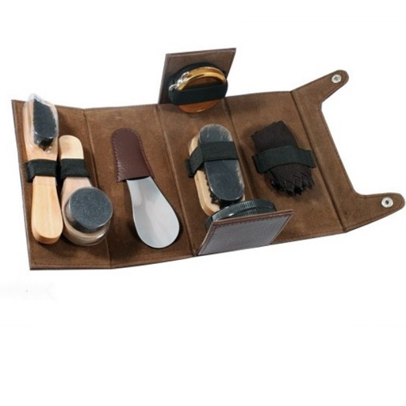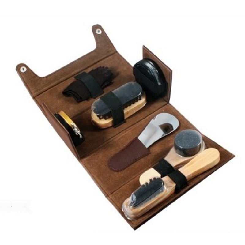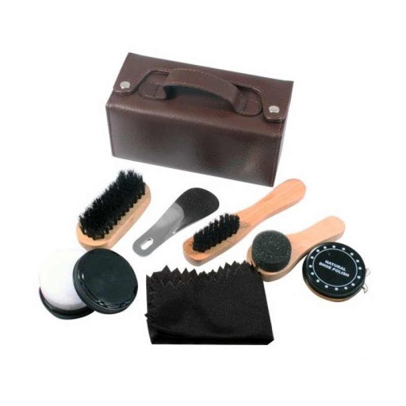 В наборе: крем для обуви, щетка, губка, тряпочка и лопатка.
