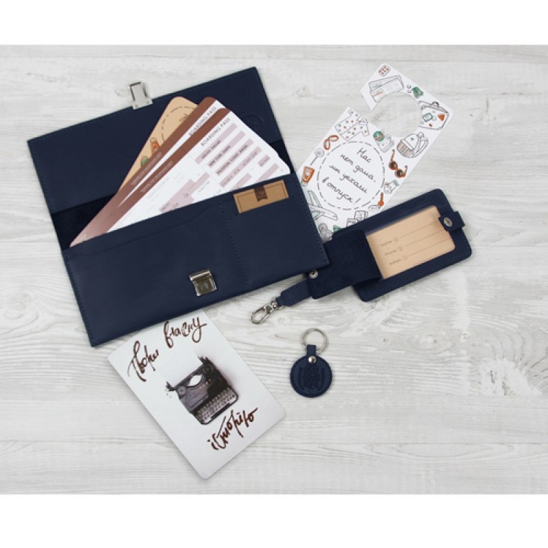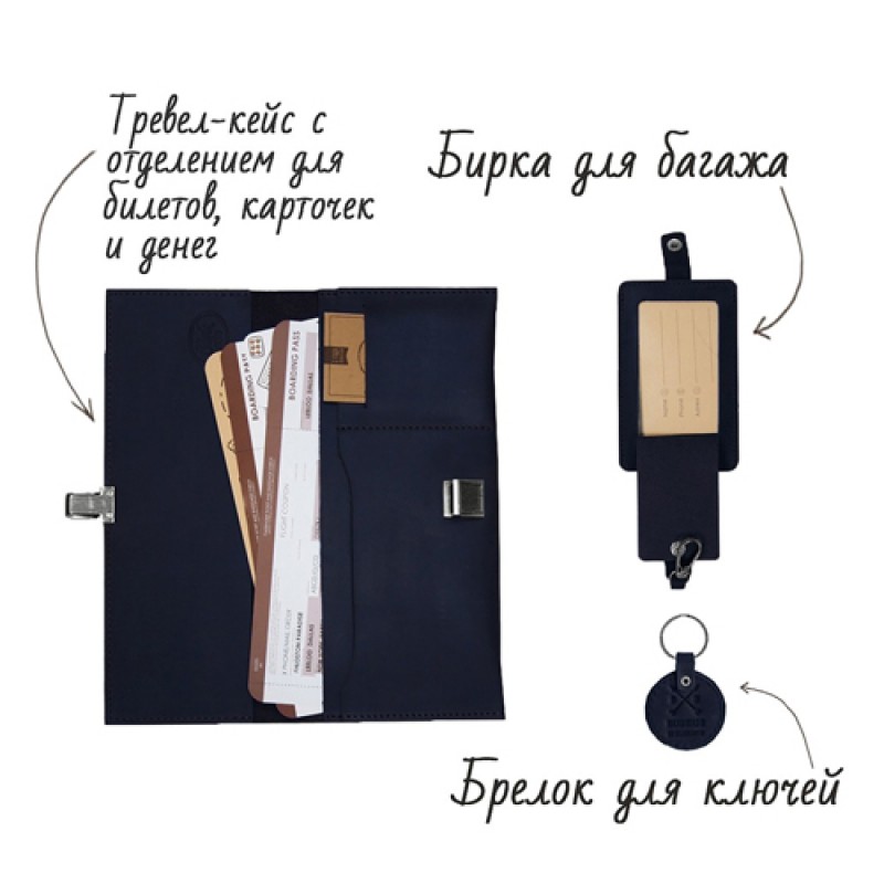 Размеры: тревел-кейс (12х24 см), бирка для багажа 22,5х7,5 см), брелок (4х4 см), открытка (10х15 см). Материал: натуральная кожа. Упаковка: крафтовая коробка.
