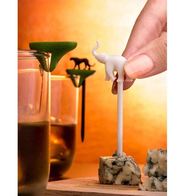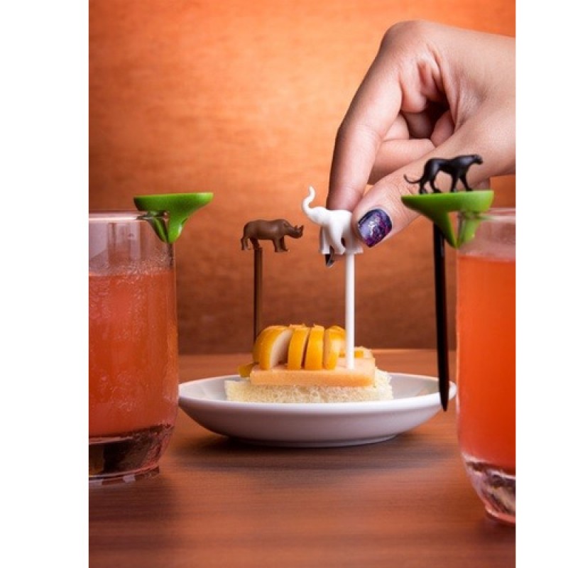 В набор входит 6 шпажек, которые крепятся таким образом, что они выполняют две функции. Первая функция - в роли маркеров, благодаря чему гости не перепутают свои бокалы, а вторая - роль шпажки, на них легко можно нанизать кусочки фруктов, сыра, или другие закуски с фуршетного стола. КНабор шпажек-маркеров для бокалов Cool Party Animal Qualy оригинально смотрятся на бокалах или стаканах, становясь яркой деталью на любой вечеринке.