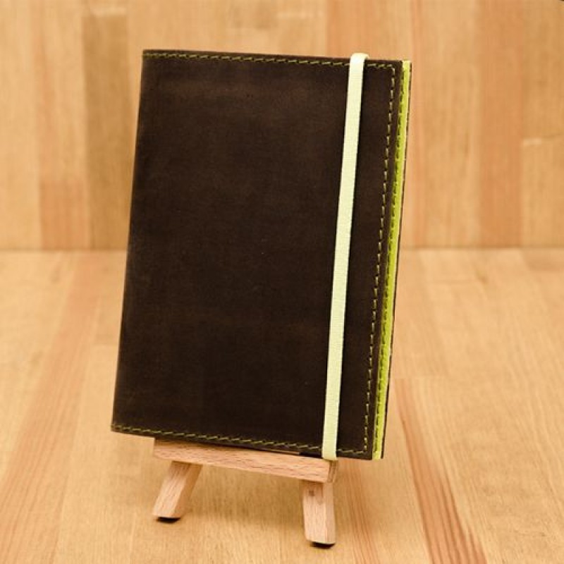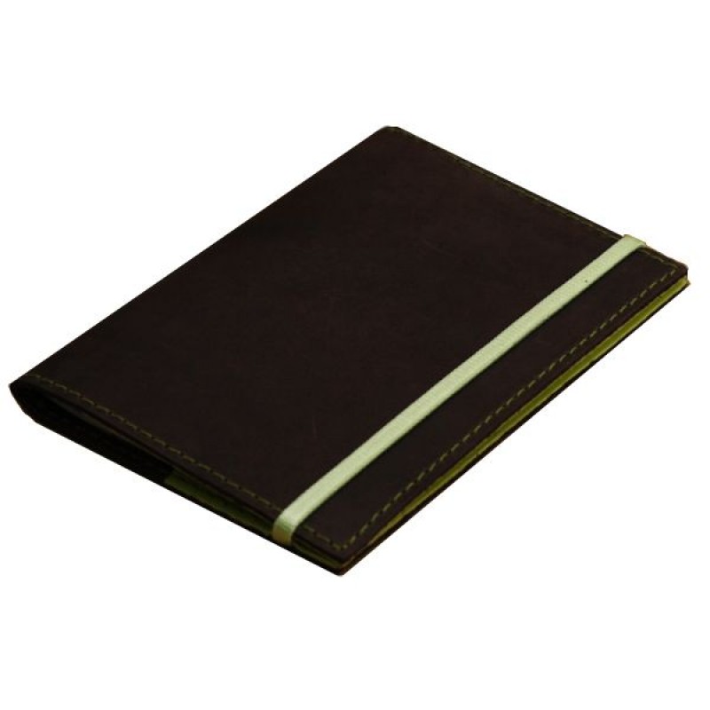 Обложка выполнена из натуральной кожи ручной работы, закрывается на резинку фисташкового цвета.