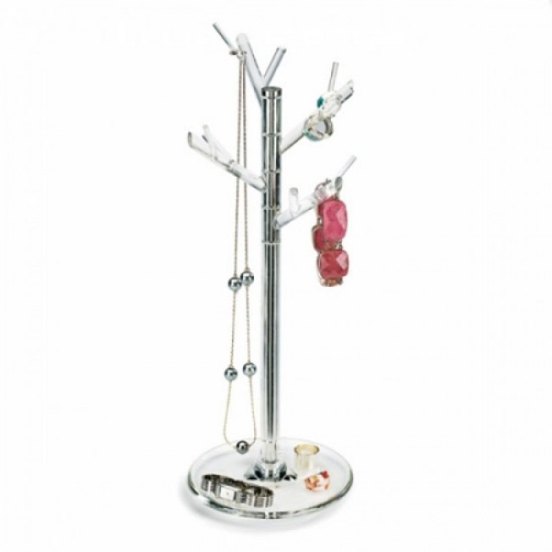 Такое дерево для украшений служит не только как подставка под бижутерию, но и как элемент декора. Дерево, с висящими на нем кольцами и серьгами, выглядит просто волшебно! Украшения превращаются в сверкающие плоды хромированного дерева. Подставка для украшений из этого дерева выйдет просто чудесная! На устойчивом столбике расположились четыре большие ветки с несколькими маленькими веточками на них.