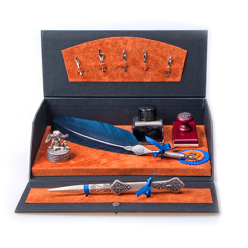 Набор включает в себя: нож для конвертов и бумаги, перо, чернило, пресс-папье, 5 сменных перьев для каллиграфического письма.