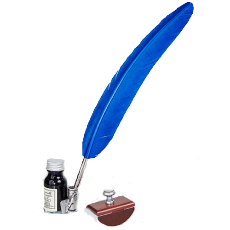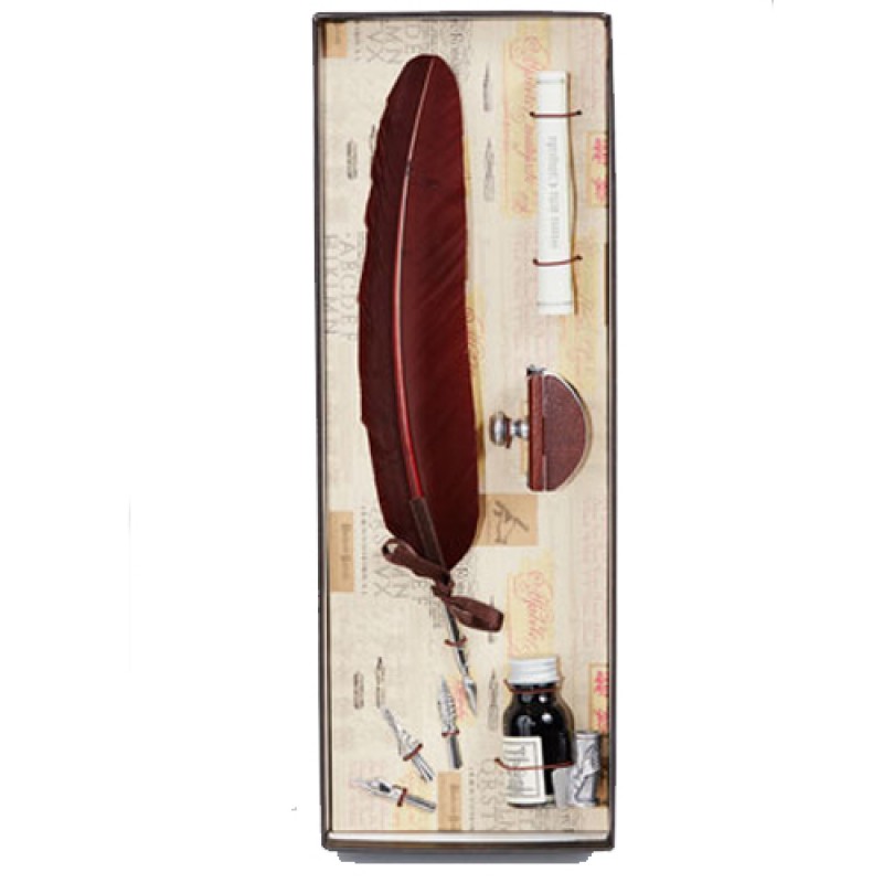 Письменный набор итальянского качества, который сосоит из: гусиное перо коричневое; четыре стальных пера; чернило черное в бутыле с подставкой для пера; пресс-папье;