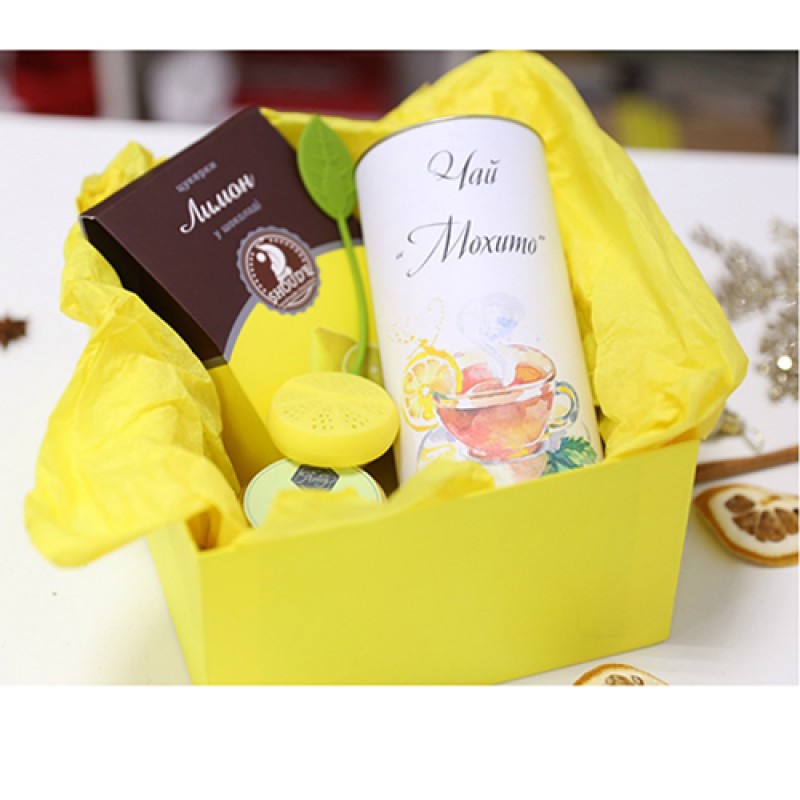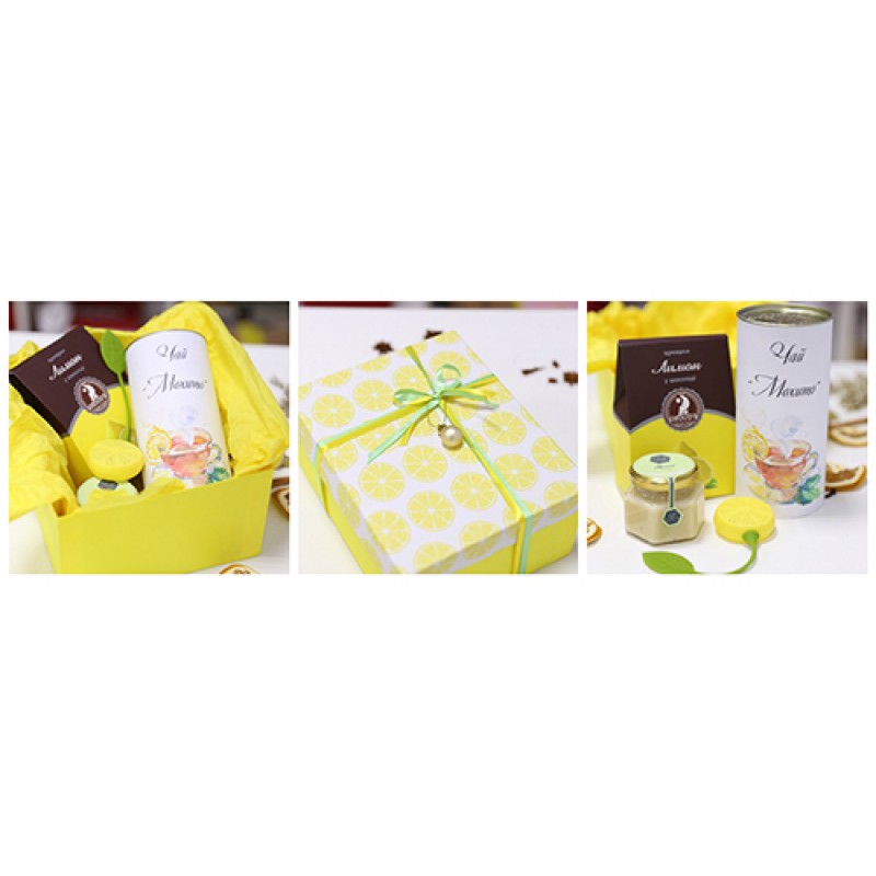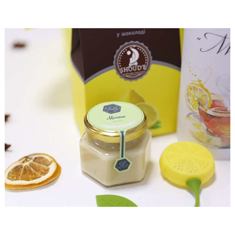 | Состав | Лимон в шоколаде ТМ “Shoud’e”. Крем-мед “Мохито” с мятой и лимоном . Чай "Мохито" в тубусе - 80 г. Ситечко для чая "лимон". Подарочная коробка с наполнителем и декором. |