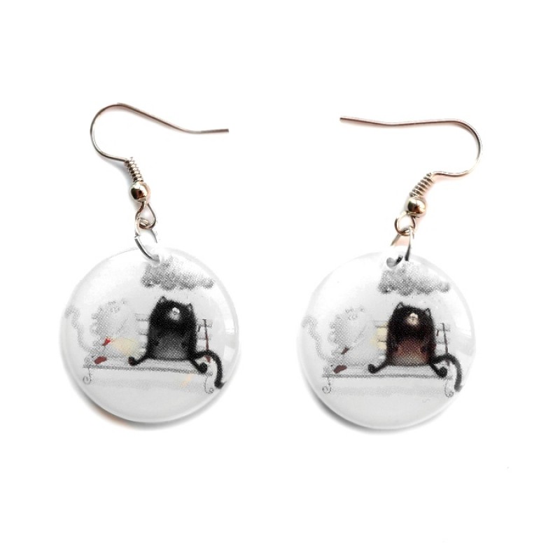 Сережки ручной работы с яркими и интересными картинками подчеркнут неординарность и креативность девушки. Фурнитура сережек гиппоаллергенная, сплав материала не содержит никеля.