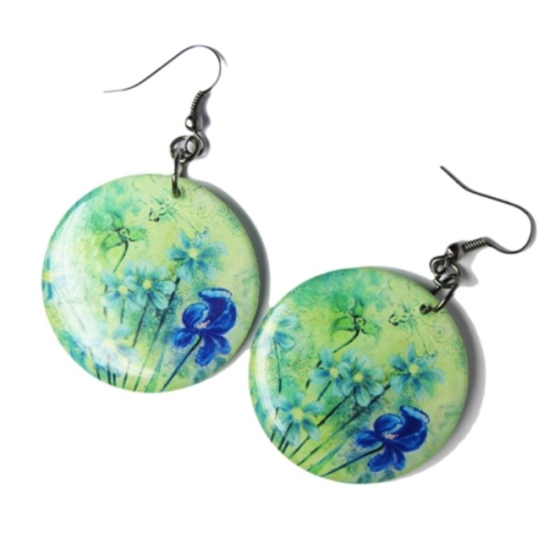 Сережки ручной работы с яркими и интересными картинками подчеркнут неординарность и креативность девушки. Фурнитура сережек гиппоаллергенная, сплав материала не содержит никеля.