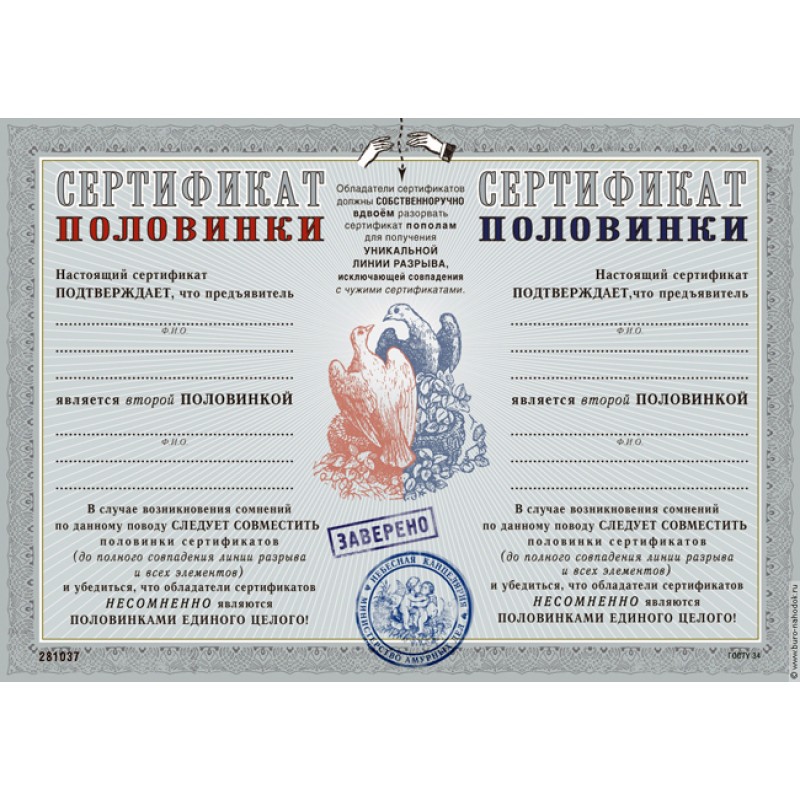 Сказать о своих чувствах любимого человеку порой не так легко, как кажется. Иногда слова могут заменить оригинальные подарки, такие, как, скажем, Сертификат половинки. Даже в самые трудные времена этот Сертификат будет напоминать влюбленным о чувствах, страсти, "закаленной" временем и различными испытаниям на жизненном пути. Кроме того, Сертификат можно повесить на стену в рамочке или, разорвав на две половинке, хранить каждый в заветном месте...
