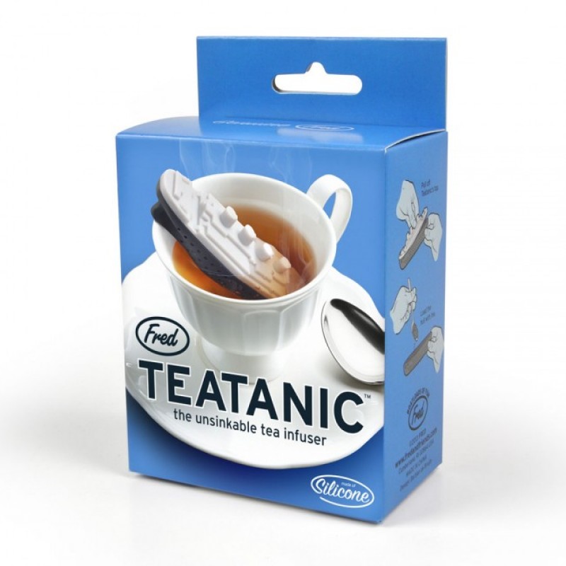 Купить ситечко для заваривания чая – первый шаг к тому, чтобы стать мастером чаепитий. Если Вы любите качественный чай, который продается не в пакетиках, то эта покупка совершенно необходима. Кому нравится пить чай и есть его листья одновременно?:-) Заварник для чая Teatanic – весьма оригинальное и практичное решение. Такой заварник позволит не только наслаждаться великолепным вкусом чая, но и наблюдать за небольшим корабликом, плавающим в чашке. Заварник для кружки от компании Fred and Friends с удовольствием примет на борт чайные листья и отправится в пятиминутное плаванье по бескрайным просторам кипятка. Купить заварник для чая в виде Титаника можно у нас на сайте. Прекрасный подарок любителю чая. Заварник легко чистить. Изготовлено из высококачественного термостойкого пищевого силикона, никаких посторонних запахов. Можно мыть в посудомоечной машине. Поставляется в фирменной подарочной упаковке от Fred and Friends. Оригинальный продукт бренда Fred and Friends.