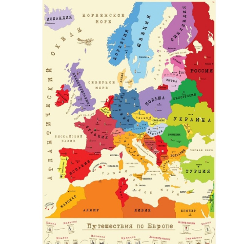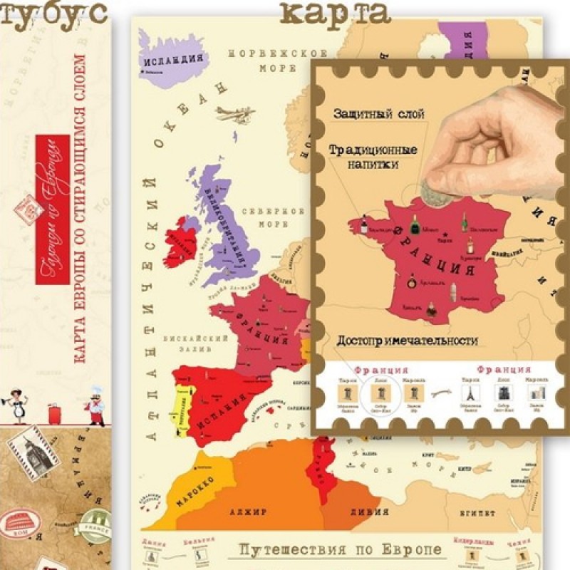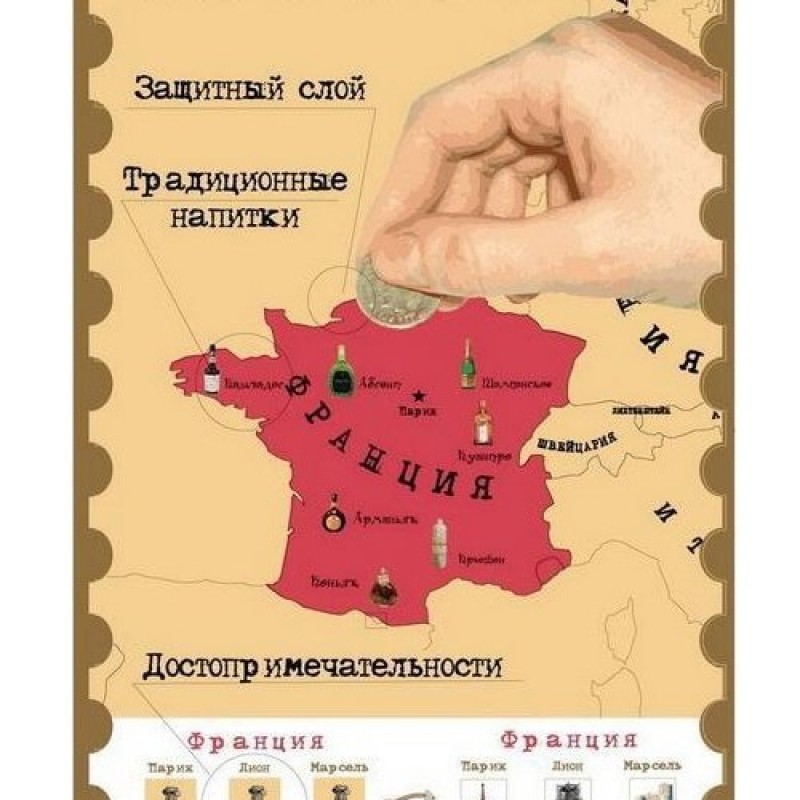 Скретч-карта "Галопом по Европам" - отличный подарок для друга, подруги, которые любят путешествовать по странам. Новая карта покрыта скретч-слоем, после того, как хозяин карты повыбает в какой-либо стране, он стирает защитный слой и место становится ярким цветом.