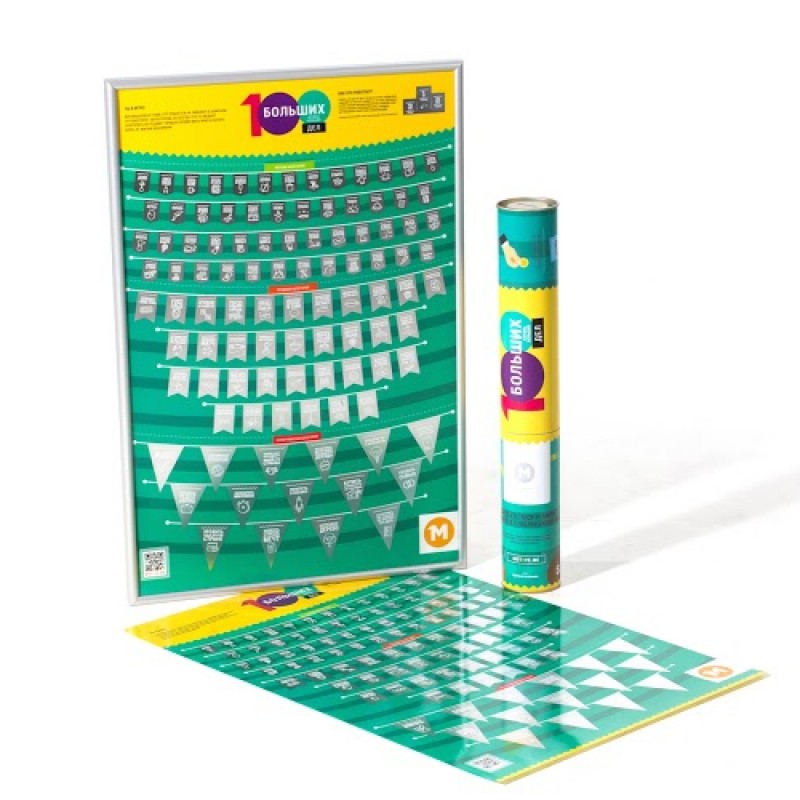Скретч-постер "100 больших и очень больших дел" упакован в яркий тубус.. При этом тубус без плаката можно трансформировать в копилку.