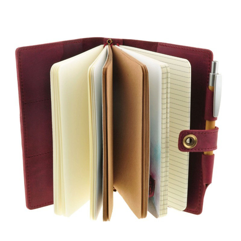 Покупайте один раз, используйте вечно! Этот блокнот исполнен в интересном форм-факторе: не классический книжный переплет, а так называемый "софт-бук", т.е. прикрепленные к цельному куску кожи несколько тетрадей. В качестве обложки - натуральная кожа цвета коралл. Внутри - классический блокнот, разделенный на три съемные тетради. Тетради крепятся внутри обложки при помощи резинки и при необходимости с легкостью заменяются на новые. В каждой тетрадке - по 40 листов. Бумага трех видов: молочного оттенка, крафт, линованная белая. Обложка тетради выполнена из высококачественного плотного дизайнерского картона, листы собраны на металлические скобы. На обложках принты серии "Ethnic animals".