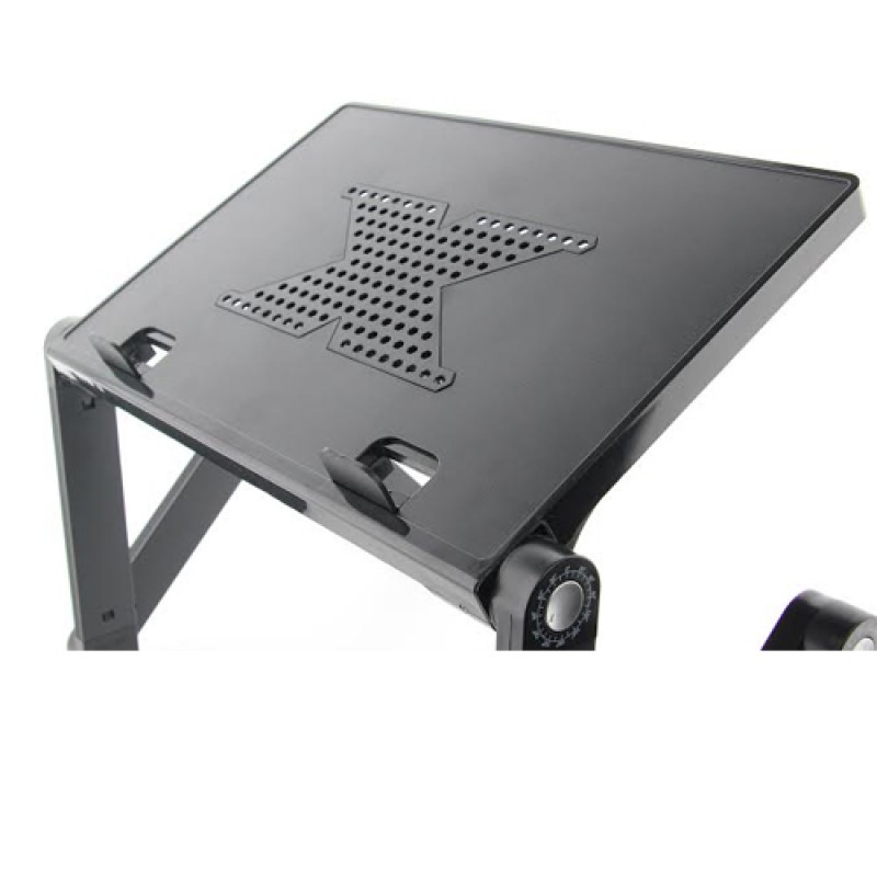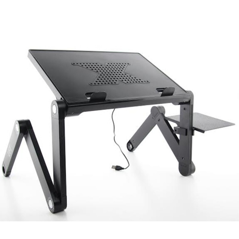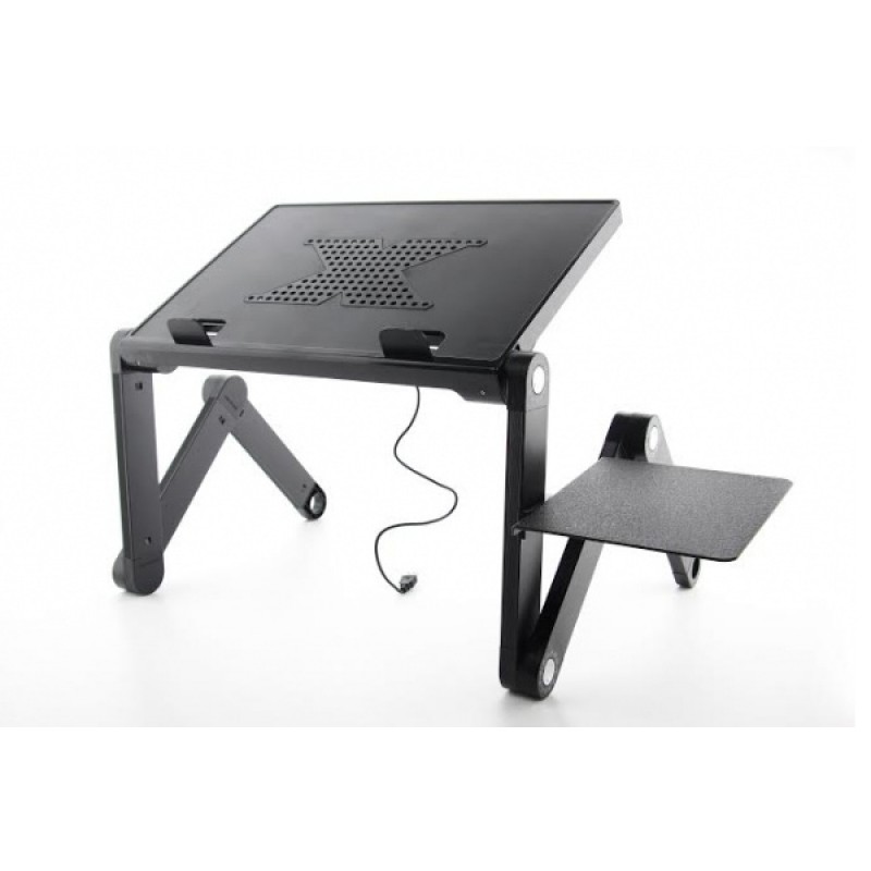 Питание: от порта USB Материал Столешница/ножки: ABC-пластик/сплав алюминия Шарниры: ABC-пластик Размеры В сложенном виде (ШхВхГ): 520 х 275 х 50 мм Столешница (ШхВ): 420 х 275 мм Рабочая поверхность (ШхВ): 420 х 270 мм Подставка под мышку: 155 х 165 мм Предельная высота: 480 мм Длина одной секции ножки: 220 мм Дополнительные характеристики: Вес: 1,7 кг Максимальная нагрузка: 15 кг Цвет: Черный Поверхность: Матовая Особенности: Подставка для мышки фиксируется на любой высоте на ножке столика как слева так и справа Предельный угол наклона столешницы: 360° Складные пластиковые упоры для того что бы ноутбук не падал Комплектация: Столик для ноутбука, подставка под мышку, открытый передний упор с прячущимися фиксаторами ноутбука, USB кабель питания
