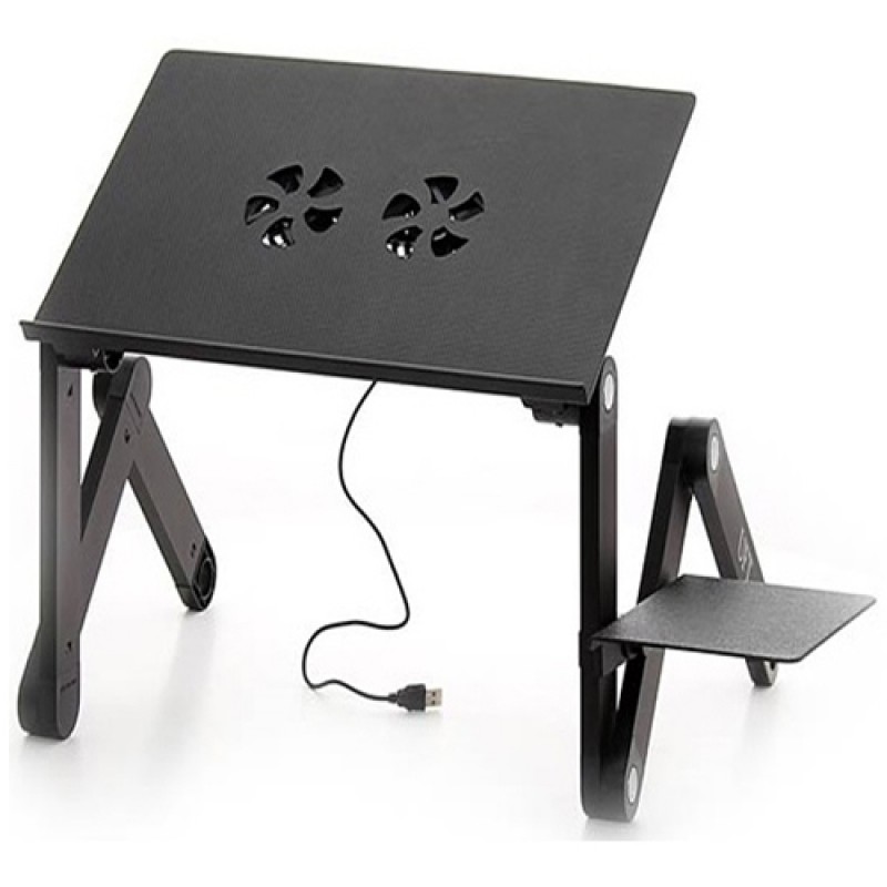 Его также можно использовать как столик для завтрака, для рисования и письма. Характеристики: Подходит ноутбук: 14' 15' 16' 17' 18' 19' Охлаждение: Активное Вентиляторы: 2 USB хаб: - Питание: от порта USB Материал Столешница/ножки: Сплав алюминия Шарниры: ABC-пластик Размеры: В сложенном виде (ШхВхГ): 490 х 280 х 50 мм Столешница (ШхВ): 420 х 280 мм Рабочая поверхность (ШхВ): 420 х 275 мм Подставка под мышку: 155 х 165 мм Предельная высота: 480 мм Длина одной секции ножки: 220 мм Дополнительные характеристики: Вес: 1,7 кг Максимальная нагрузка: 15 кг Цвет: Черный Поверхность: Матовая Особенности: Подставка для мышки фиксируется на любой высоте на ножке столика как слева, так и справа Предельный угол наклона столешницы: 360° Пластиковые упоры для того что бы ноутбук не падал, двигаются по всей ширине столешницы Комплектация: Столик для ноутбука, подставка под мышку, открытый передний упор с передвижными фиксаторами ноутбука, USB кабель питания