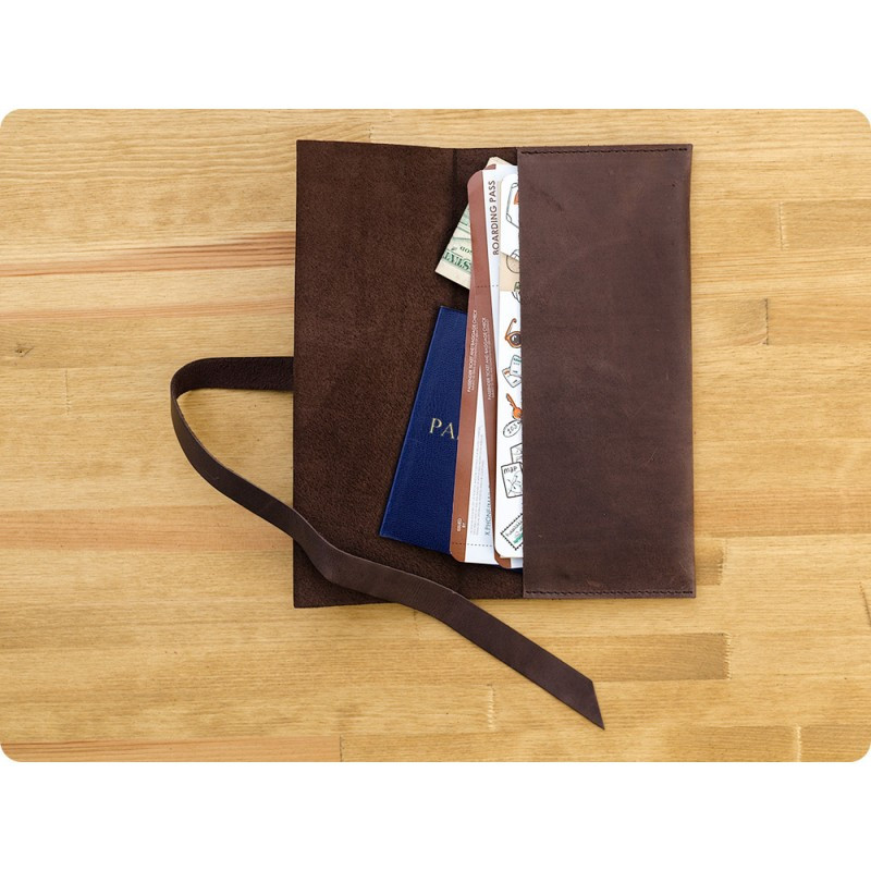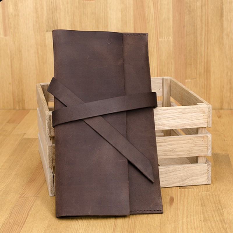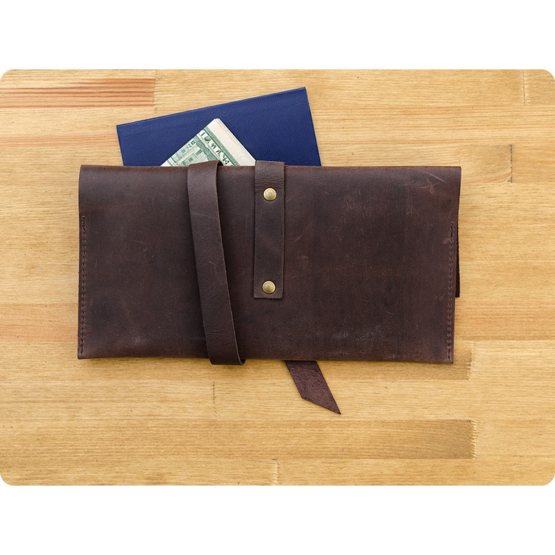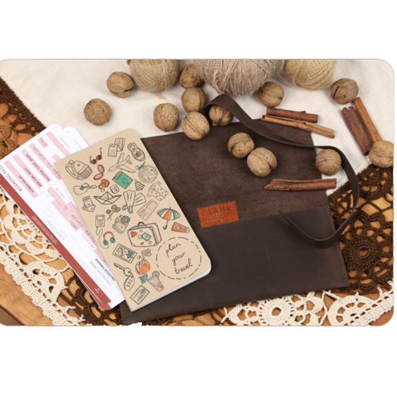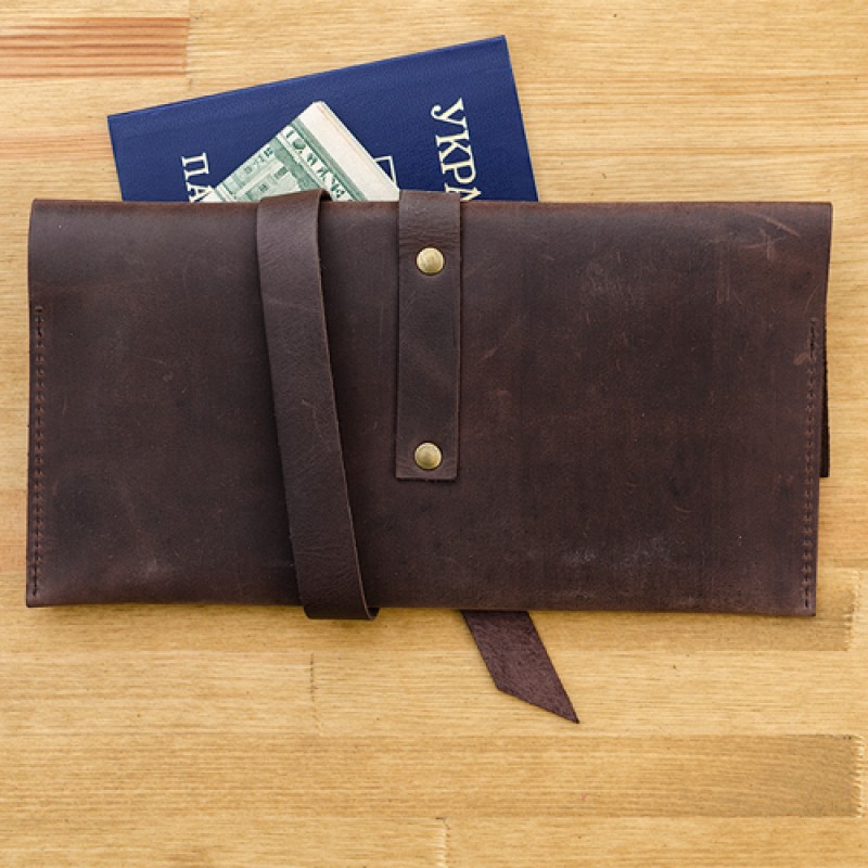 Тревел-кейс ручной работы изготовлен из натуральной кожи, что говорит о высоком качестве товара. Холдер для документов закрывается с помощью ленточки отличного цвета от самого тревел-кейса.