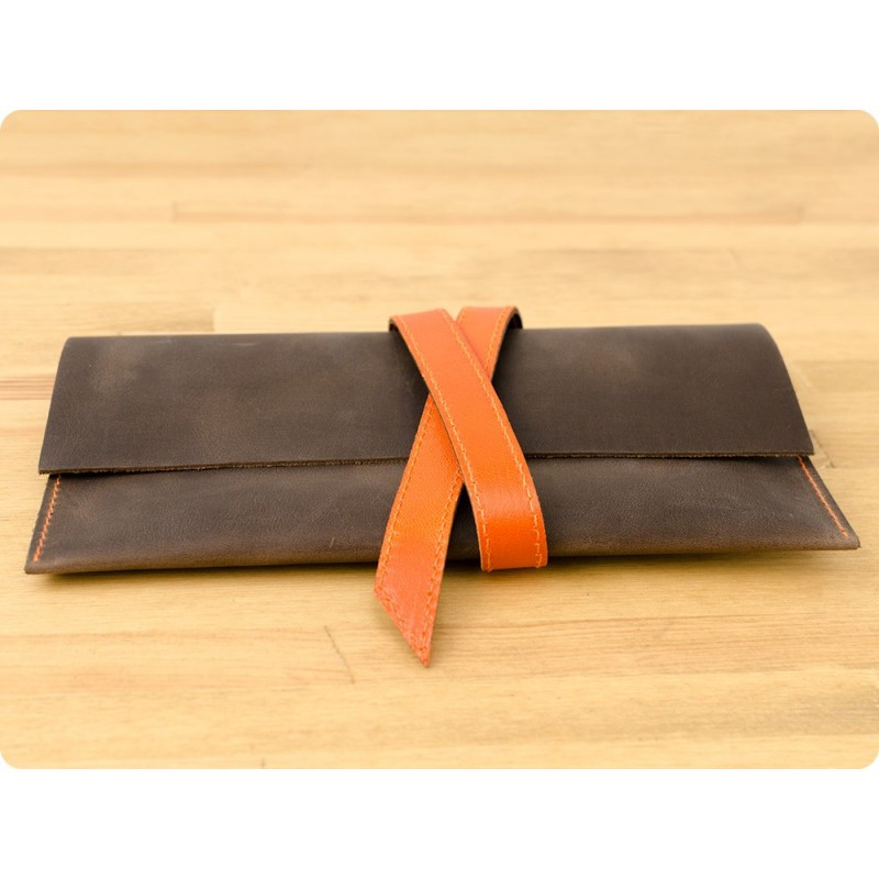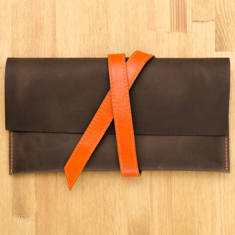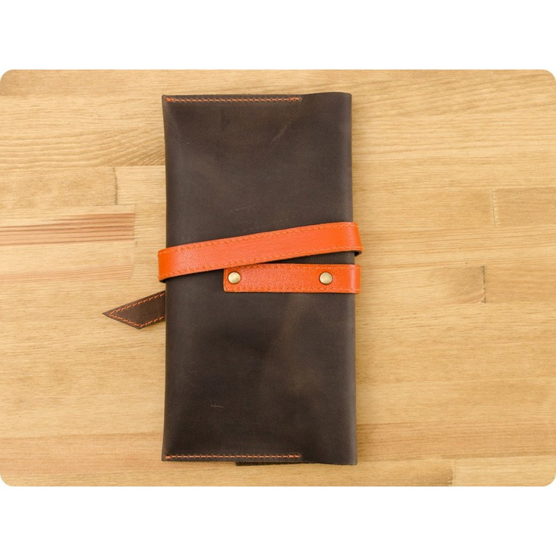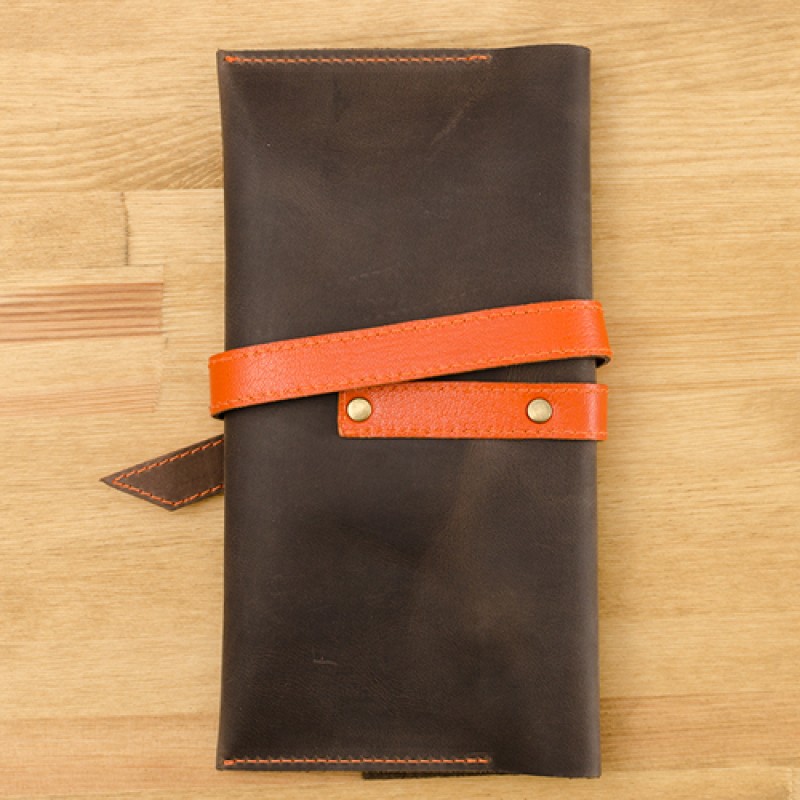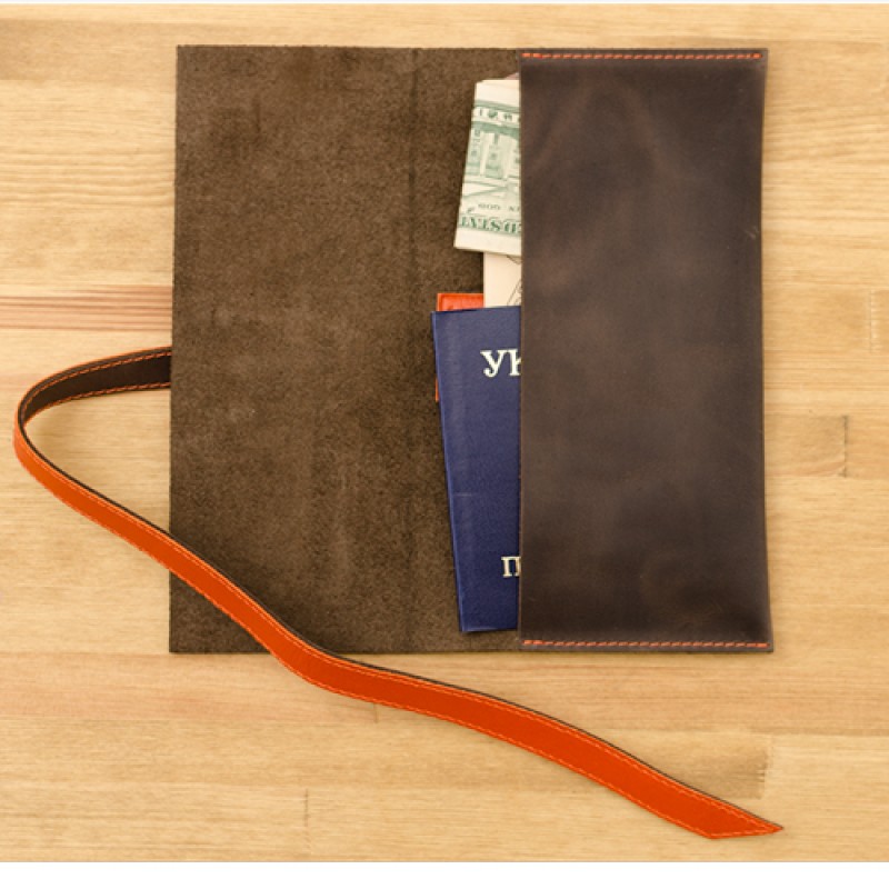Тревел-кейс ручной работы изготовлен из натуральной кожи, что говорит о высоком качестве товара. Холдер для документов закрывается с помощью ленточки отличного цвета от самого тревел-кейса.
