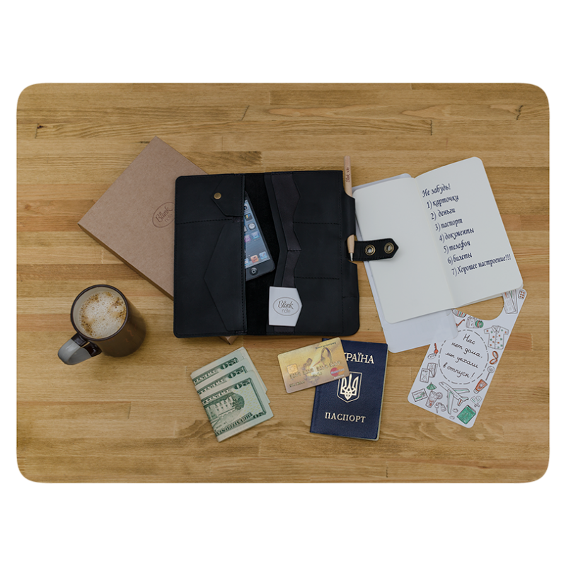 Это холдер для документов удобного размера (130х220мм), в котором поместятся посадочные талоны (или железнодорожные билеты), паспорта, деньги и масса других полезных вещей, которые должны быть всегда под рукой в путешествии.