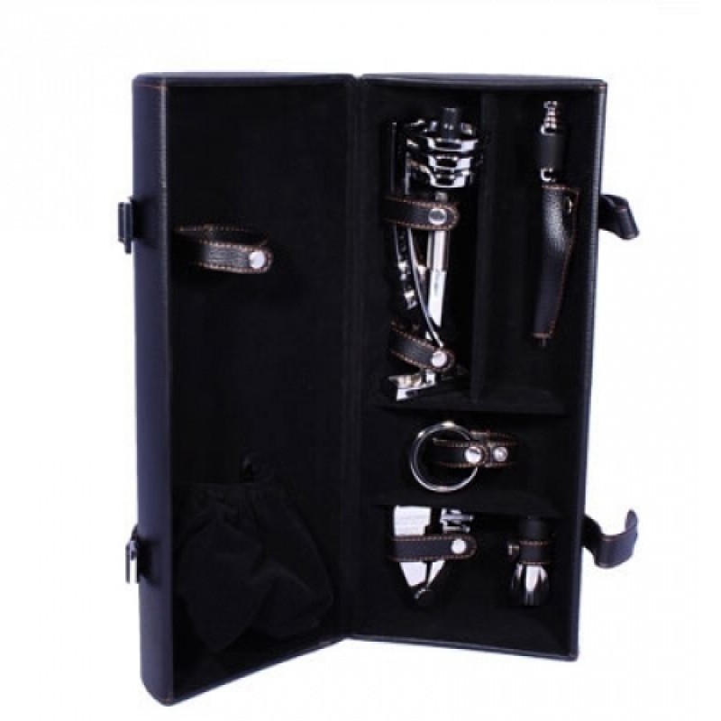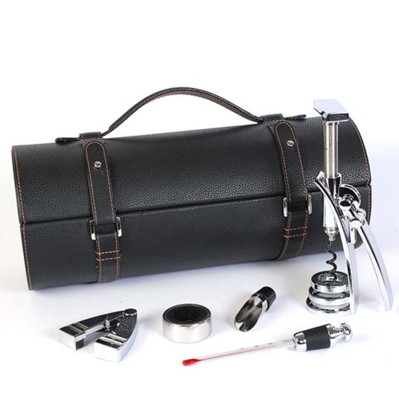 Аксессуары в винном наборе: хромированный цинковый штопор, вакуумная пробка с замком для вина, хромированный резак для фольги, красное вельветовое кольцо для вина, винонаполнитель.