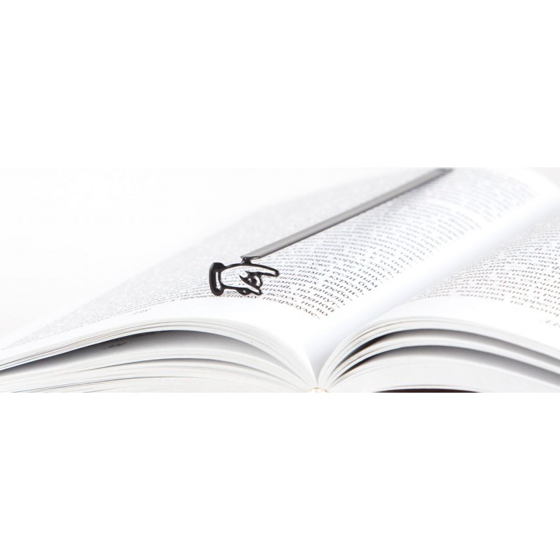 Чёрная металлическая закладка в форме руки с указательным пальце, указывающим на что-то сверх интересное.