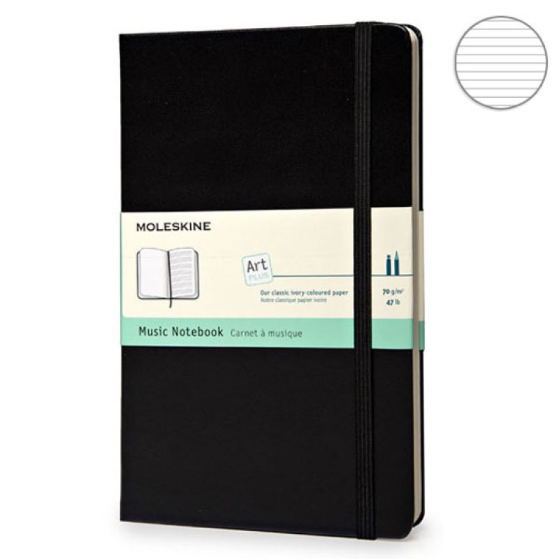Практичный блокнот Moleskine для записи нот. Твердый переплет, разлинованные страницы. Внутри есть кармашек, имеется фиксирующая резинка.