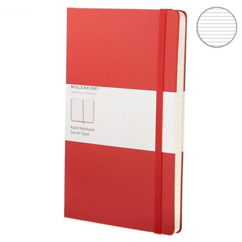 Классический красный карманный Moleskine с бумагой в линейку, классической прочной резинкой и жесткой обложкой. Внутри закладка и небольшой кармашек.