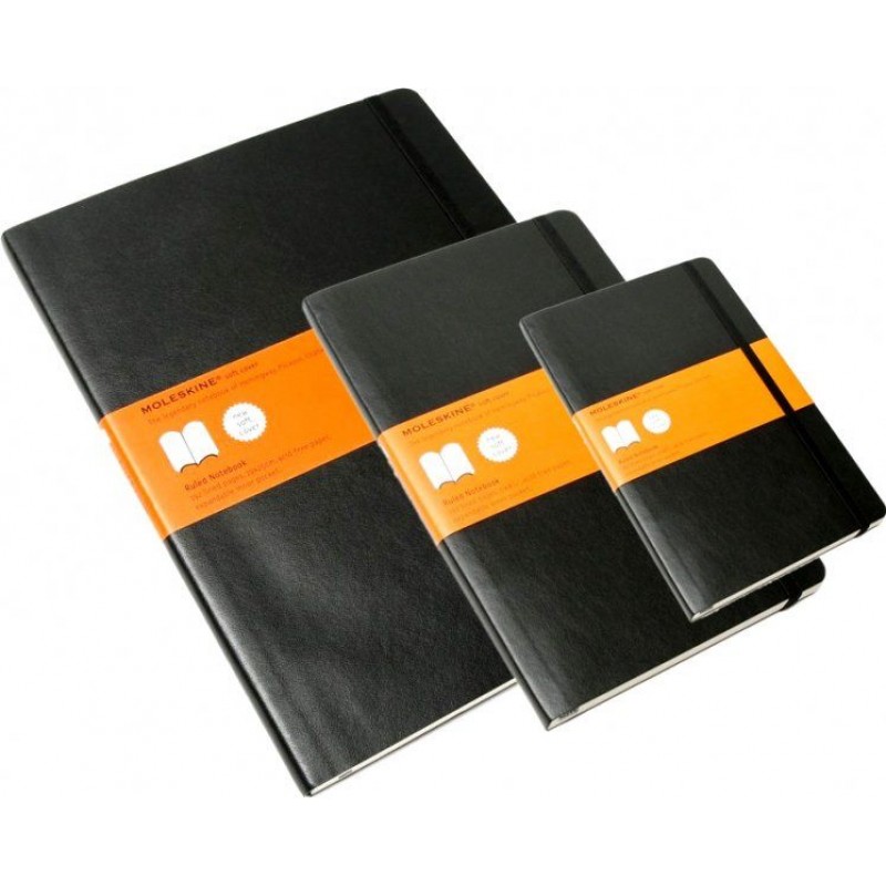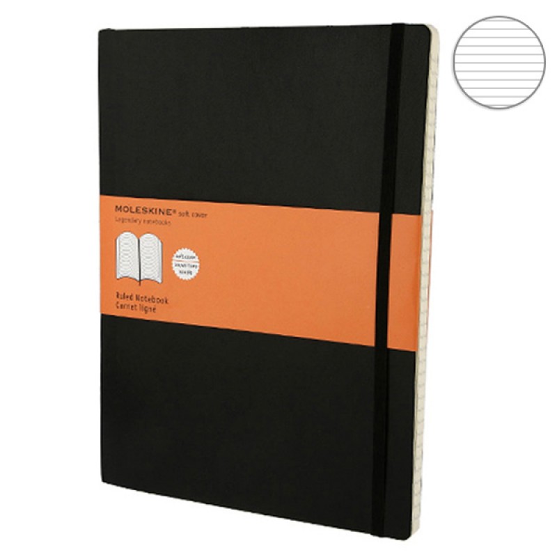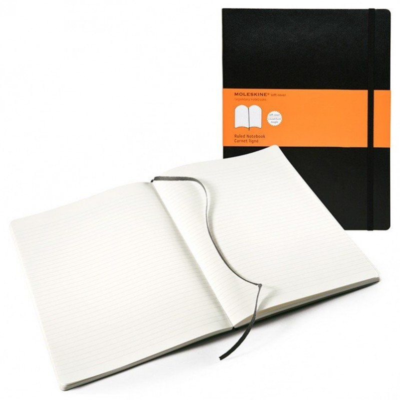 Большой блокнот Moleskine в мягкой обложке черного цвета. Качественная разлинованная бумага, внутренний кармашек и фиксирующая резинка.