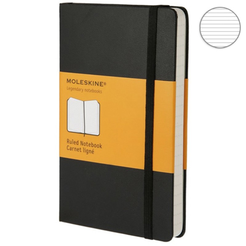 Классический молескин среднего размера в твердой обложке. Страницы размечены в линейку.