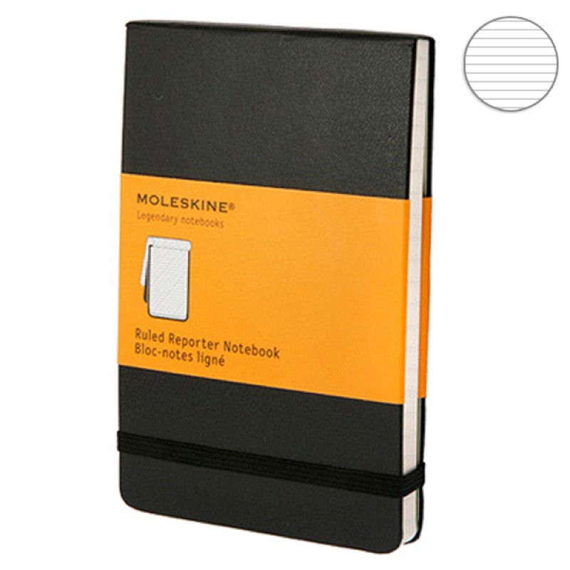 Удобный блокнот Moleskine Reporter в твердой обложке черного цвета. Страницы разлинованные, имеется фиксирующая резинка и внутренний кармашек.