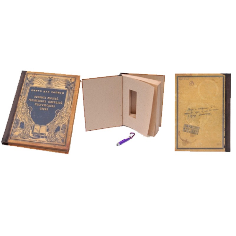 Обложка выполнена из плотного картона бежевого цвета с темно-коричневыми вставками. Страницы в записной книге - крафтовые листы. В небольшом тайнике в листах книги спрятан фонарик. Такая записная книжка станет оригинальным подарком. Вес: 0.6 кг Размер: 17 х 23,5 см.